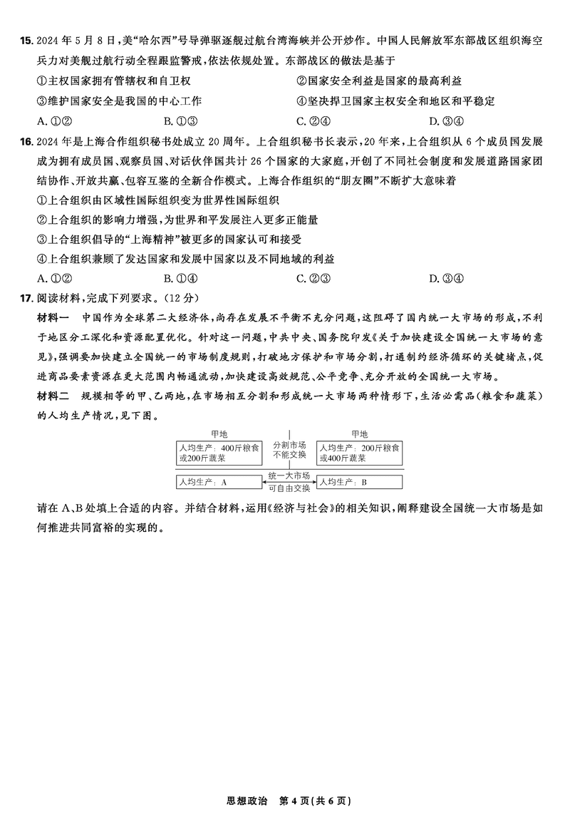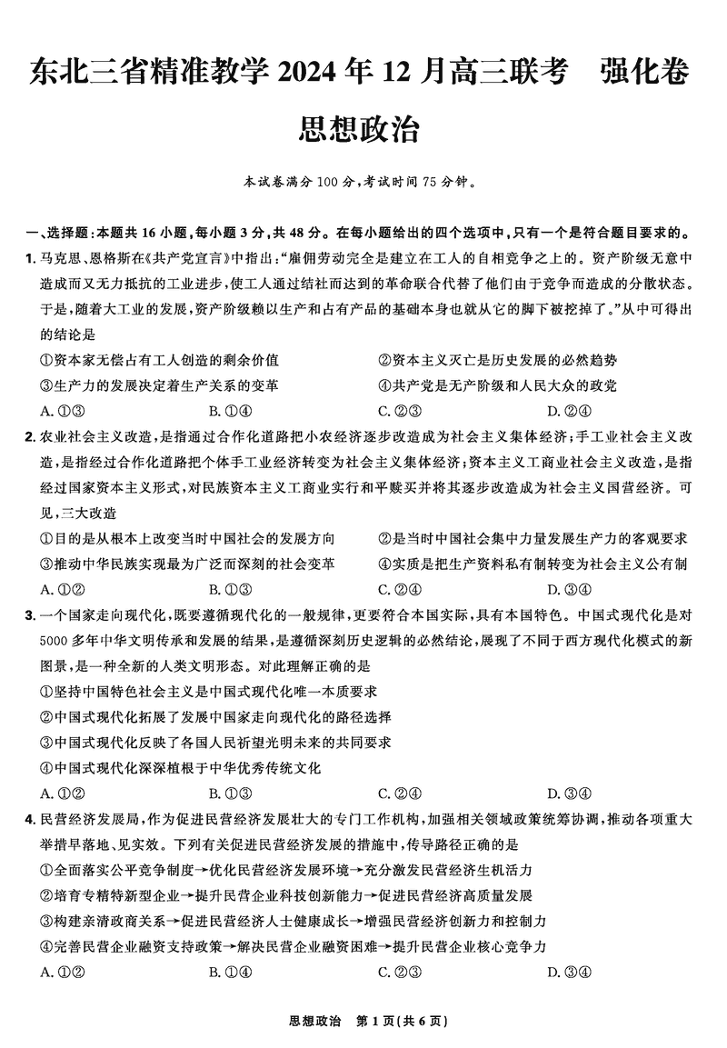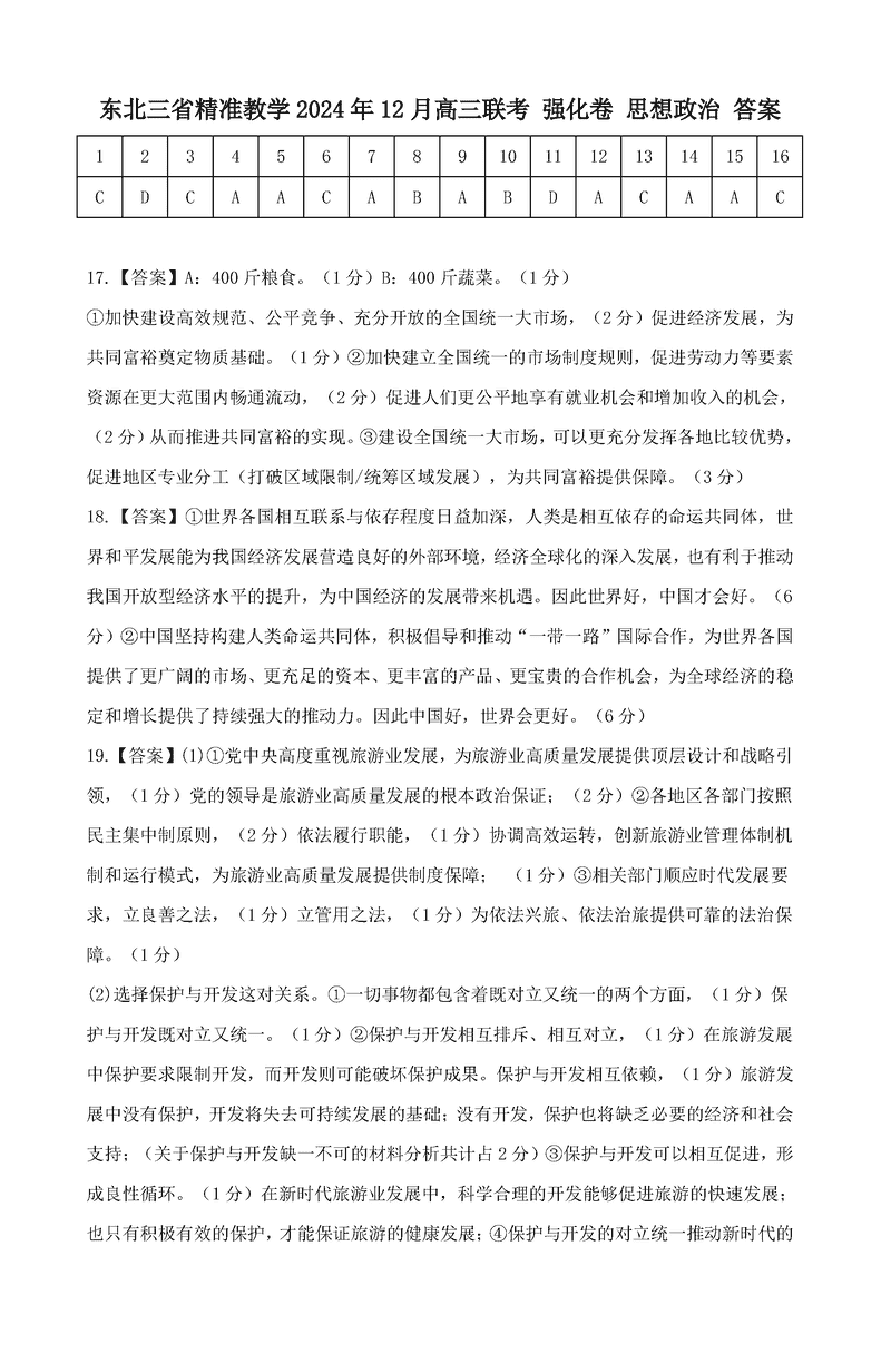 东北三省精准教学2025届高三上学期12月联考政治试题及答案
