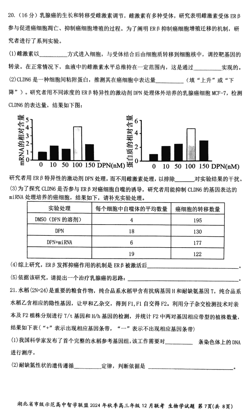 湖北智学联盟2024年秋季高三12月联考生物试题及答案