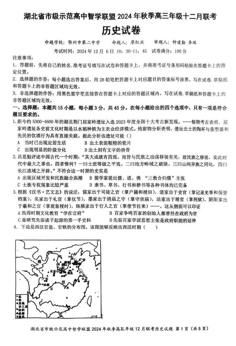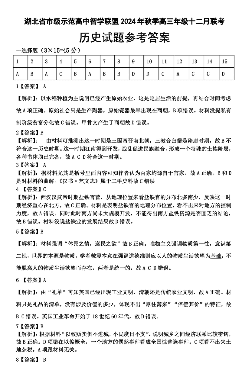 湖北智学联盟2024年秋季高三12月联考历史考试已于近日开考,为方便考生考后及时查看考试情况,查漏补缺、弥补不足,本文整理了试题答案解析相关信息!