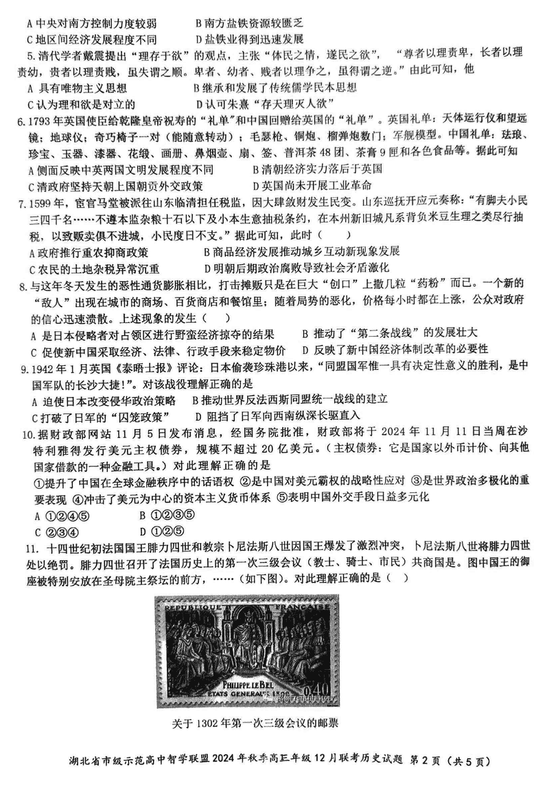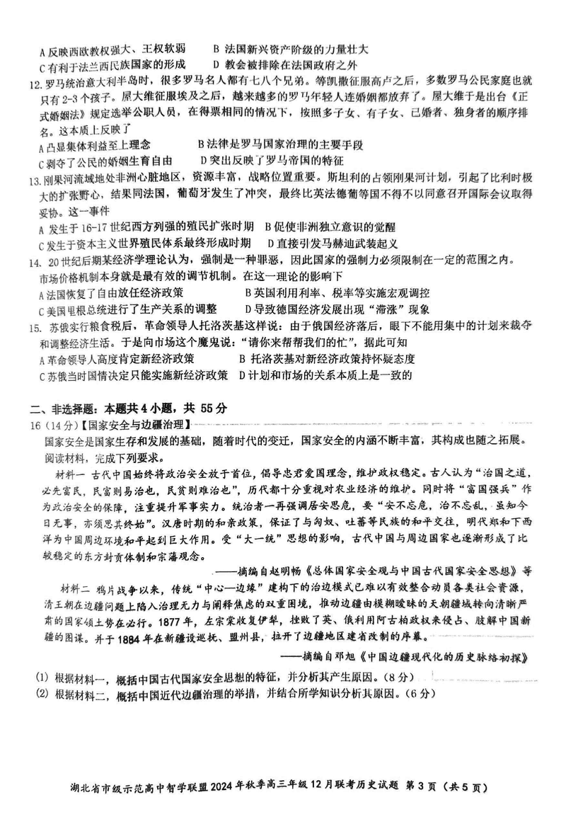 湖北智学联盟2024年秋季高三12月联考历史试题及答案