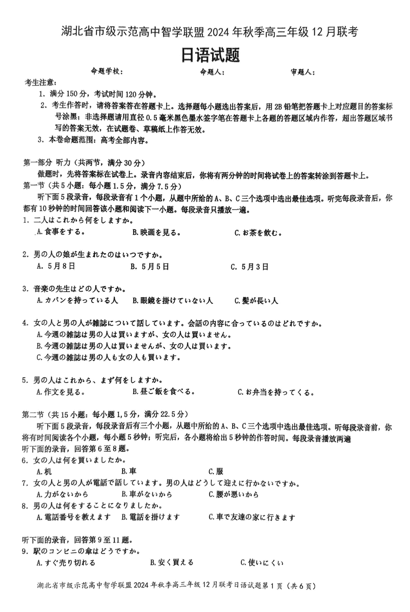 湖北智学联盟2024年秋季高三12月联考日语考试已于近日开考,为方便考生考后及时查看考试情况,查漏补缺、弥补不足,本文整理了试题答案解析相关信息!