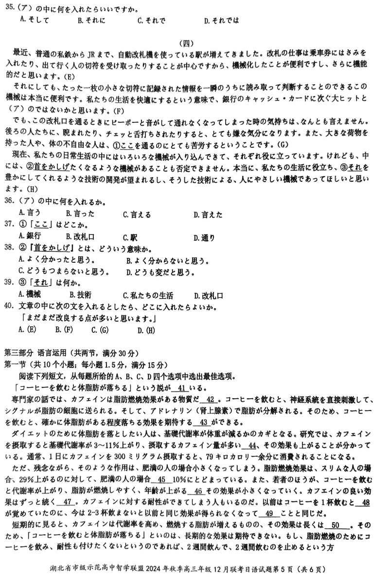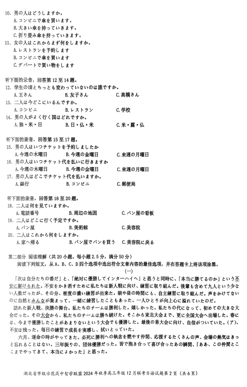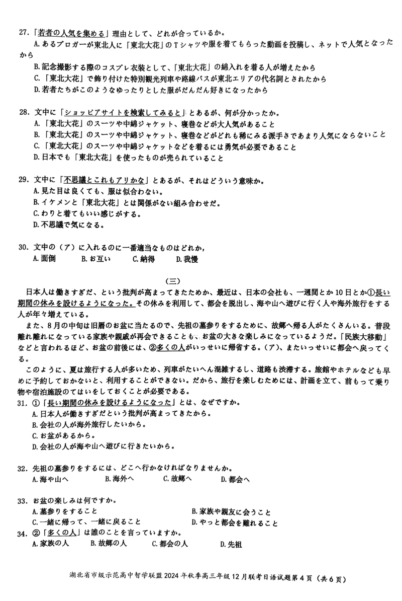 湖北智学联盟2024年秋季高三12月联考日语试题及答案