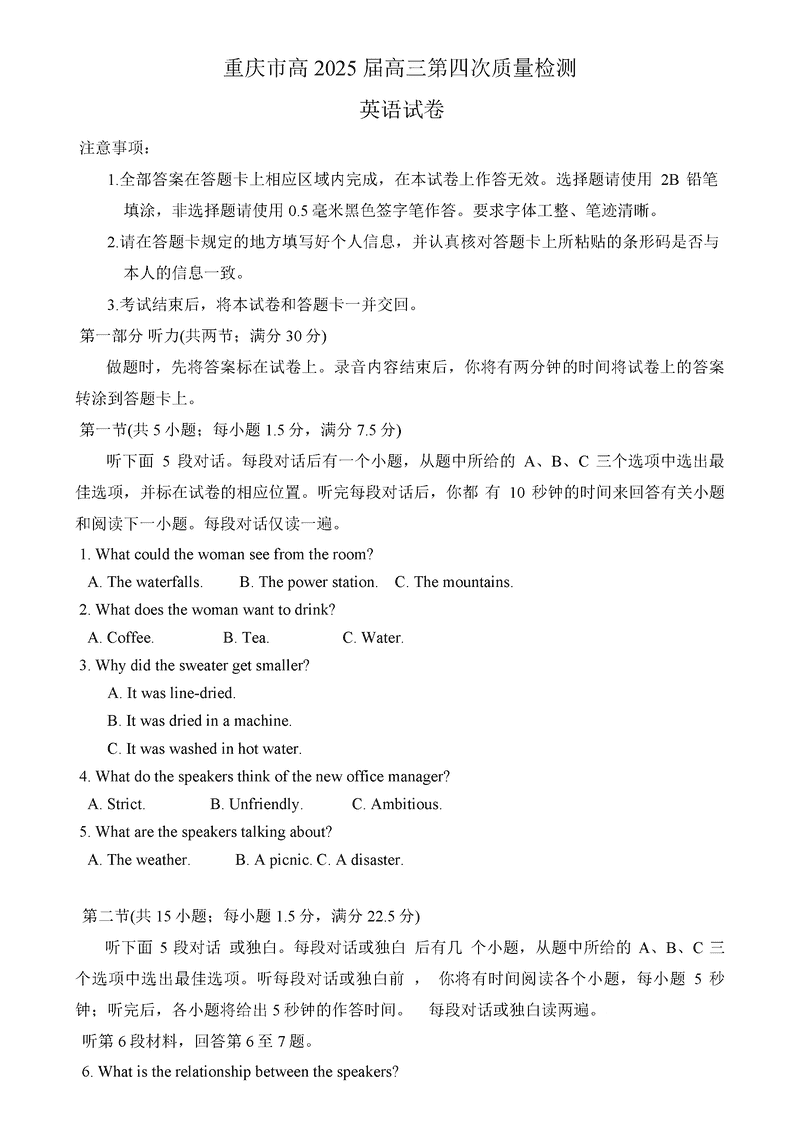 重庆南开中学2025届高三第四次质检英语试题及答案