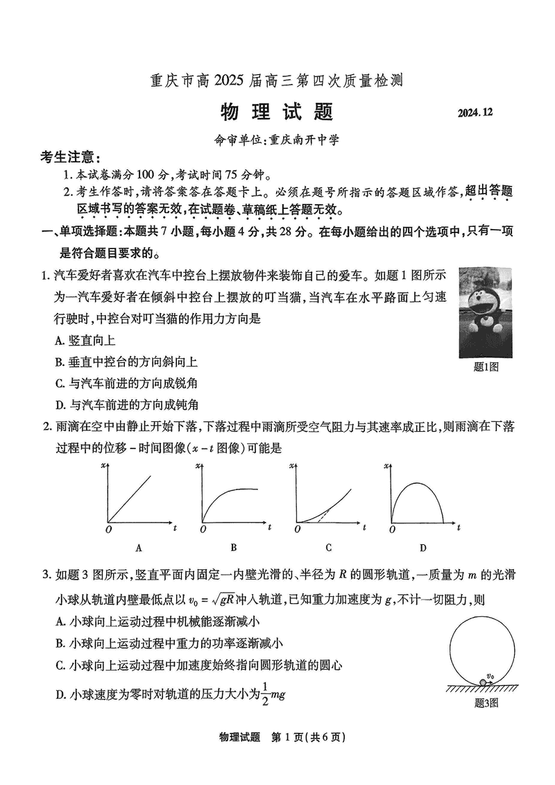 重庆南开中学2025届高三第四次质检物理考试已于近日开考,为方便考生考后及时查看考试情况,查漏补缺、弥补不足,本文整理了试题答案解析相关信息!
