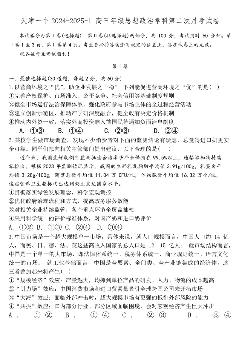 天津一中2024年高三上学期第二次月考政治考试已于近日开考,为方便考生考后及时查看考试情况,查漏补缺、弥补不足,本文整理了试题答案解析相关信息!