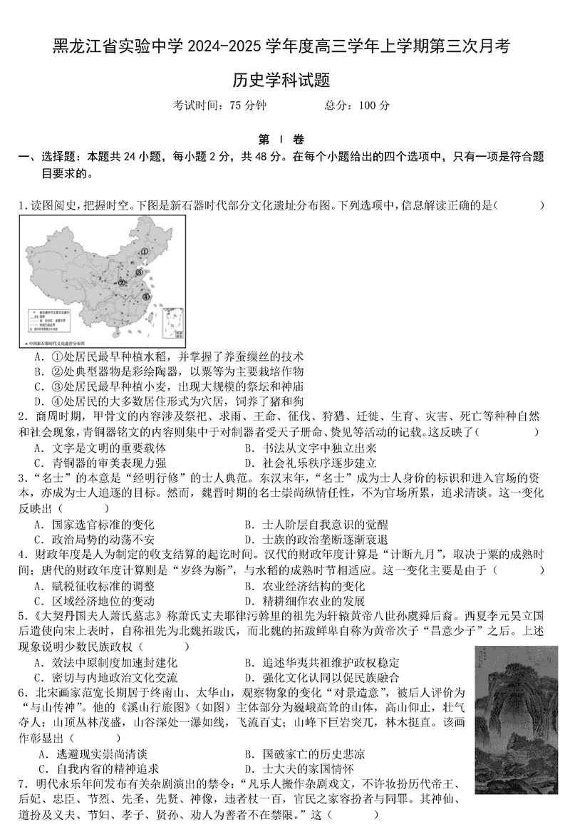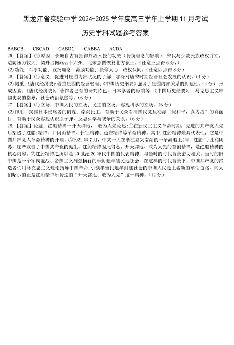 黑龙江省实验中学2025届高三上第三次月考历史试题及答案