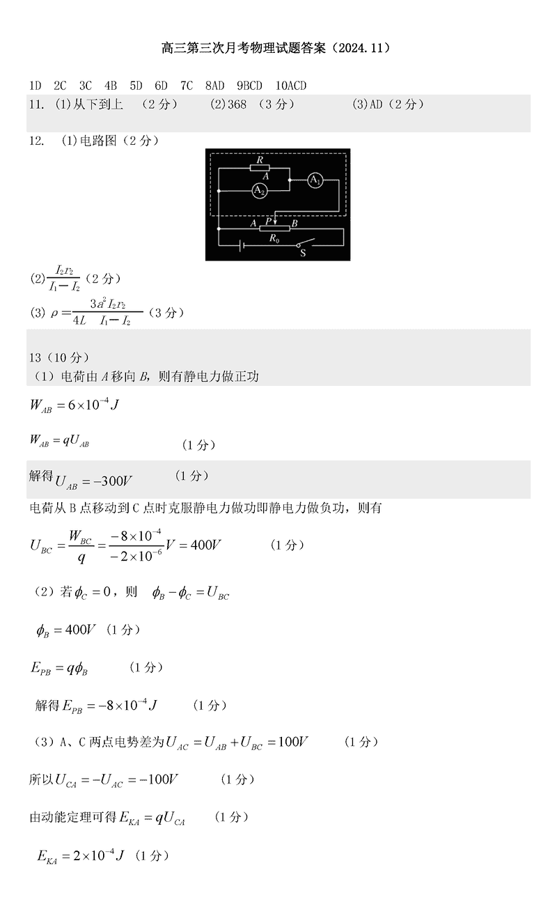 黑龙江省实验中学2025届高三上第三次月考物理试题及答案