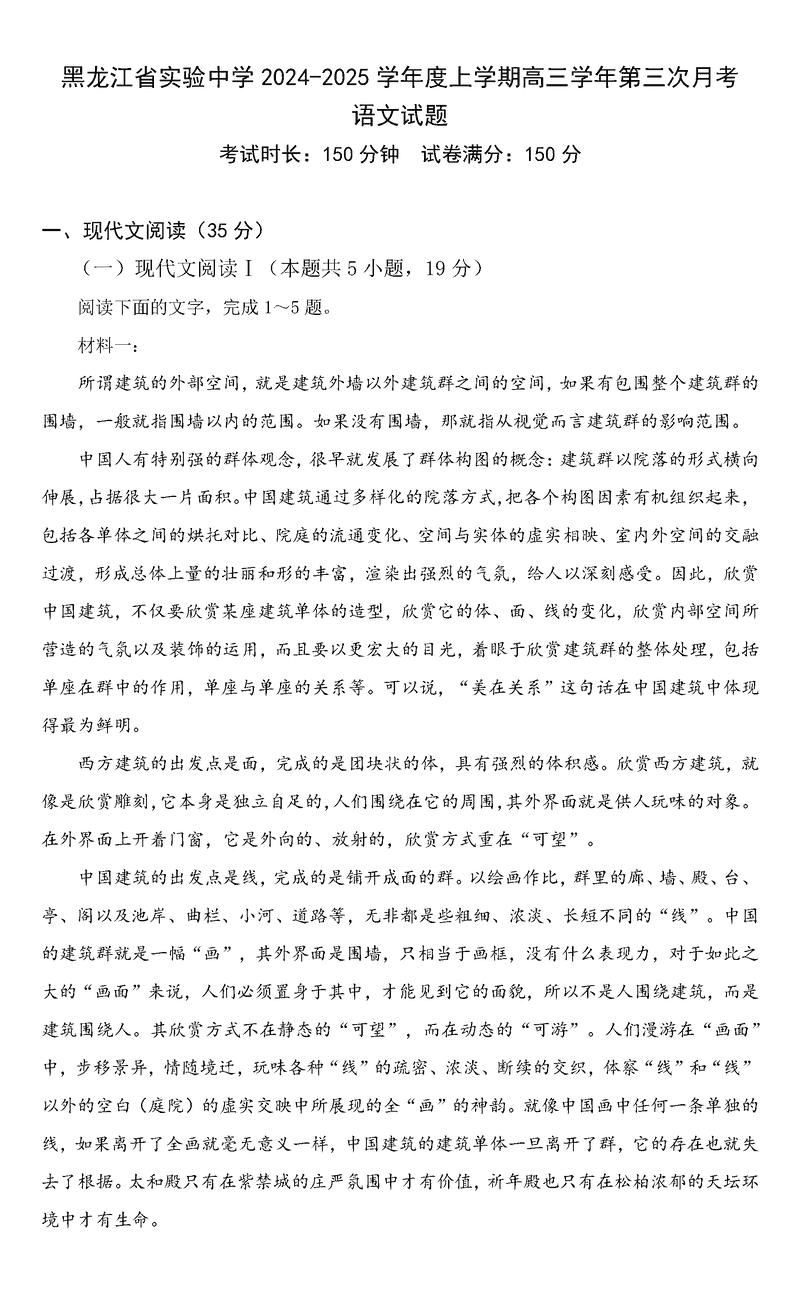 黑龙江省实验中学2025届高三上第三次月考语文试题及答案