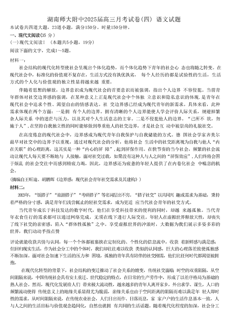 湖南师大附中2025届高三月考试卷(四)语文试题及答案