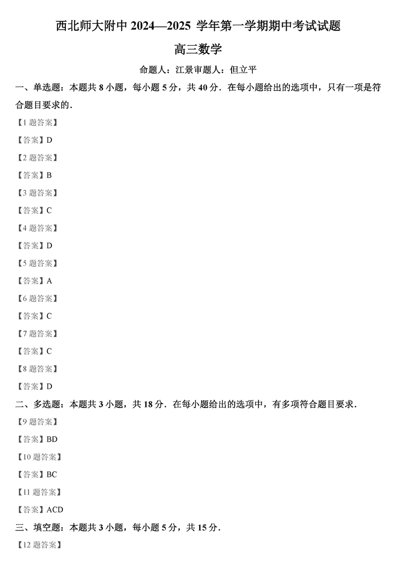 西北师大附中2024-2025学年高三上学期期中数学试题及答案