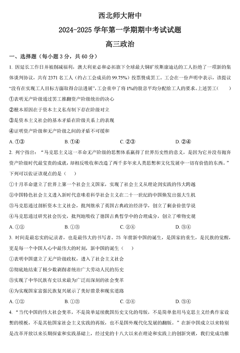 西北师大附中2024-2025学年高三上学期期中政治试题及答案