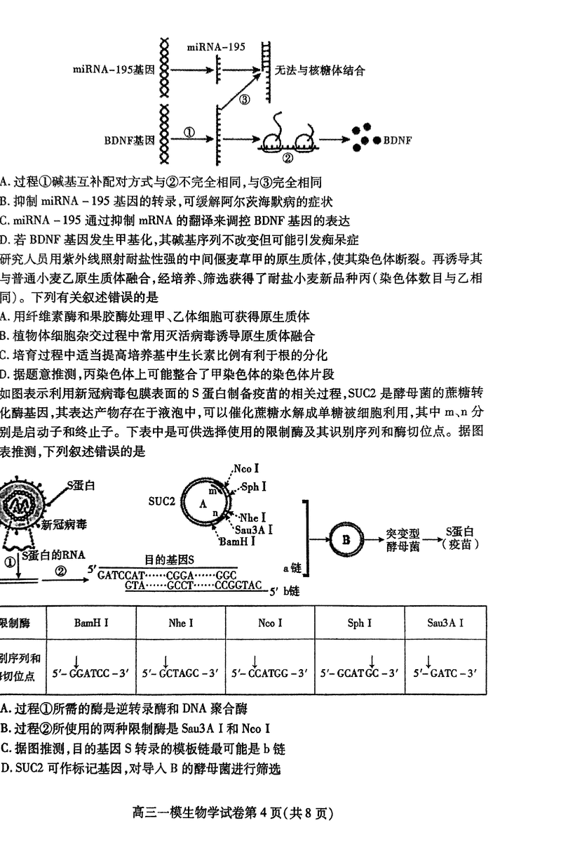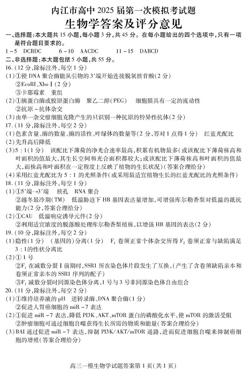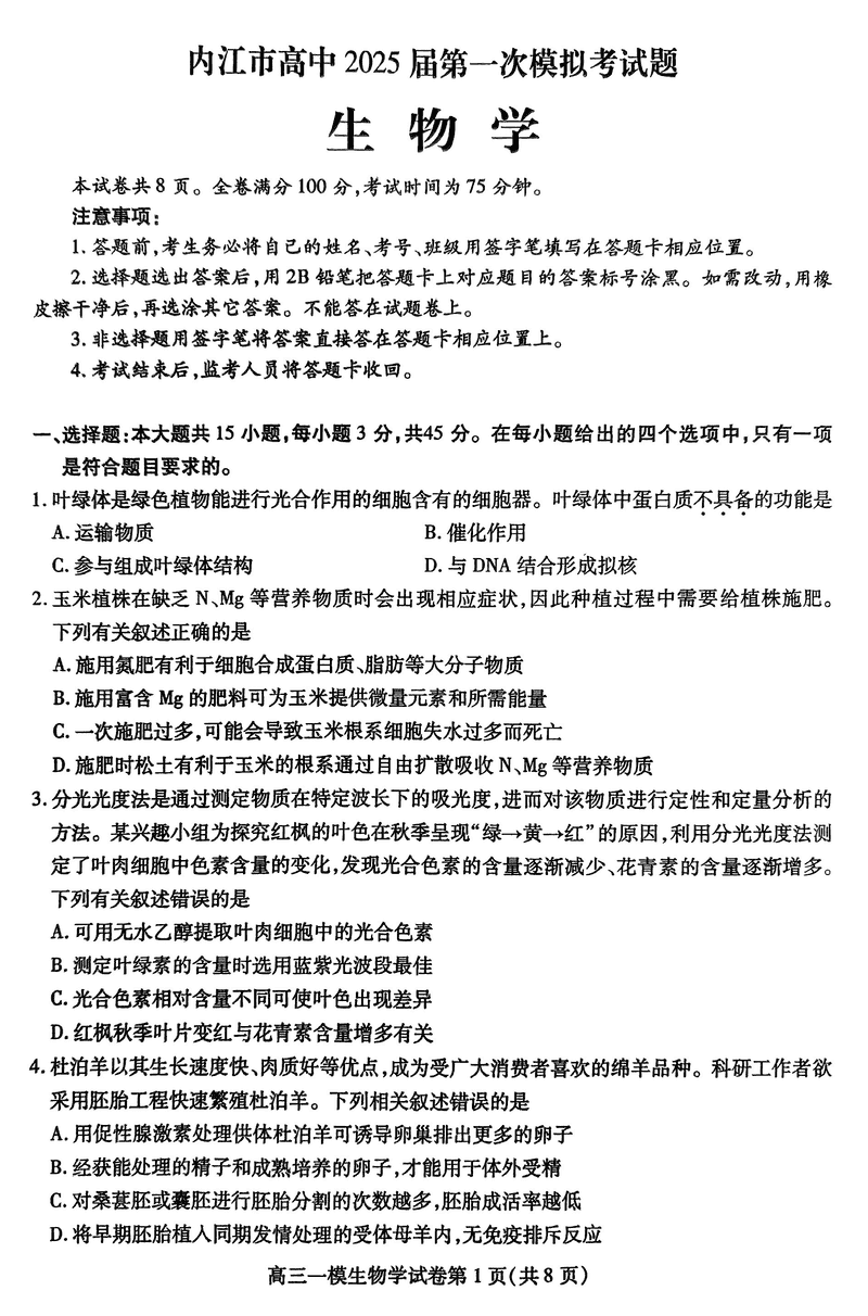 四川内江2025届高三上学期一模生物试题及答案 时间:2024-12-10 22:00 四川 理综试题 四川内江2025届高三上学期一模生物考试已于近日开考,为方便考生考后及时查看考试情况,查漏补缺、弥补不足,本文整理了试题答案解析相关信息! 汇总:四川内江2025届高三上学期一模试题及答案汇总 生物试题及答案解析