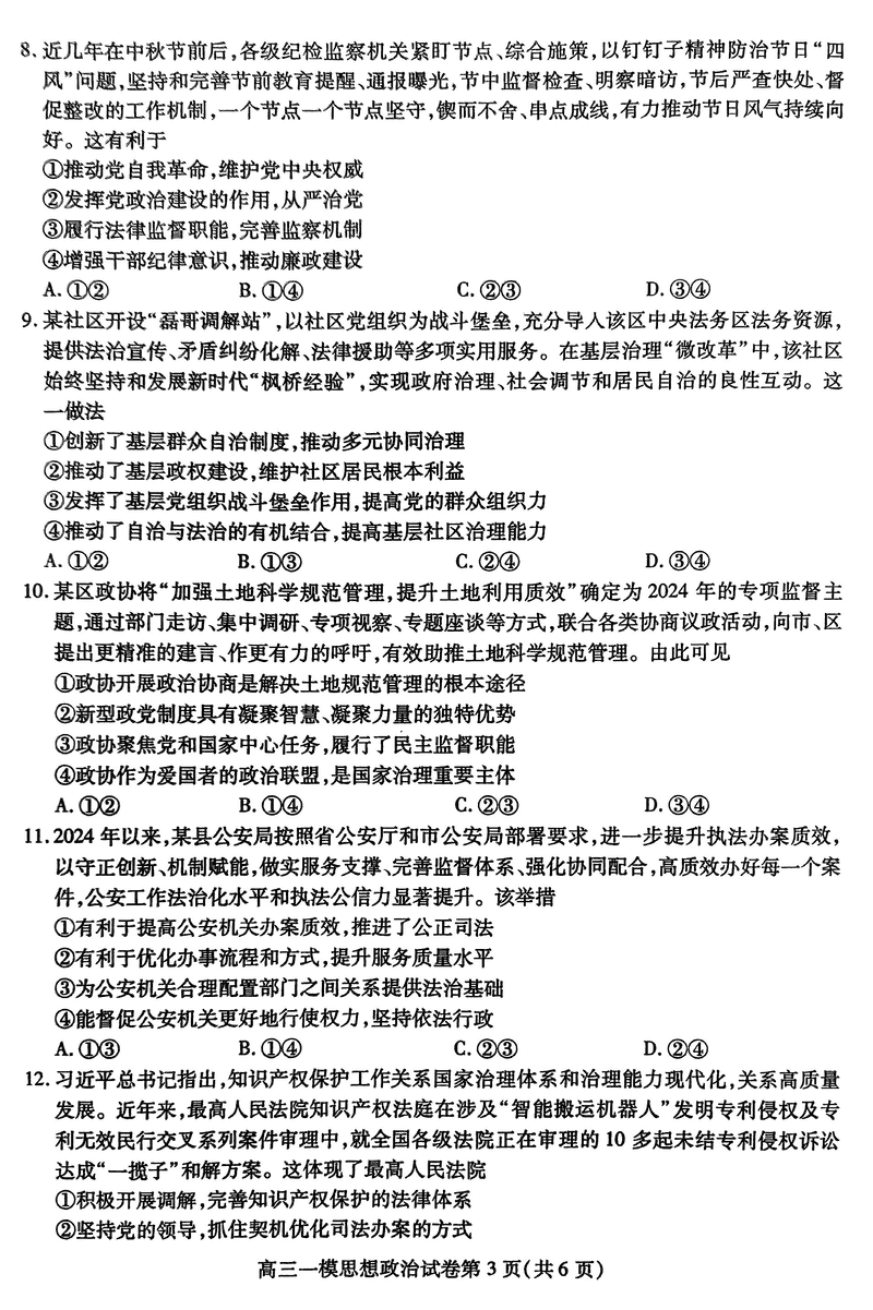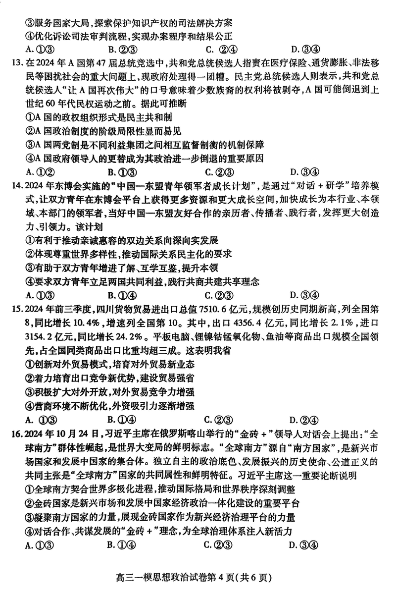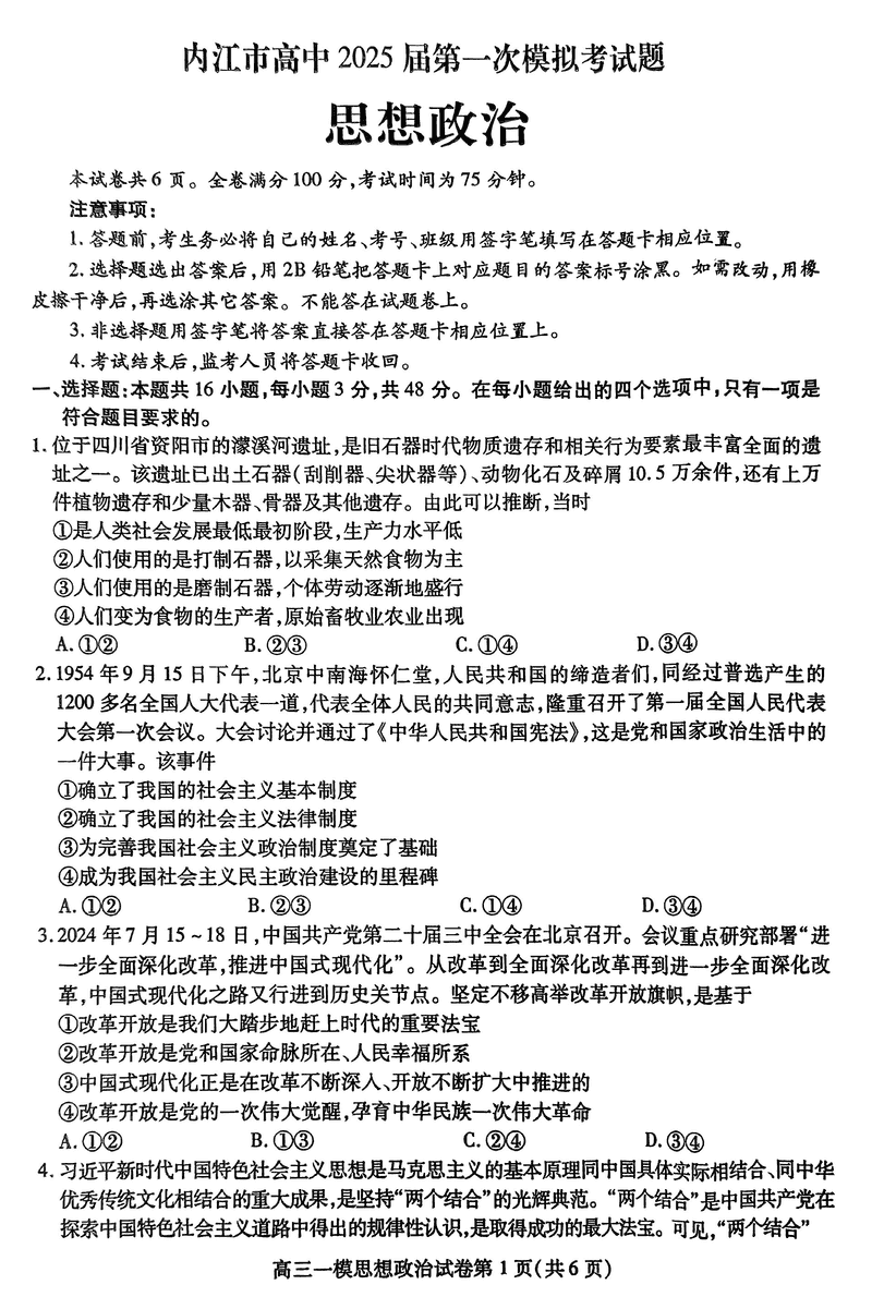 四川内江2025届高三上学期一模政治试题及答案