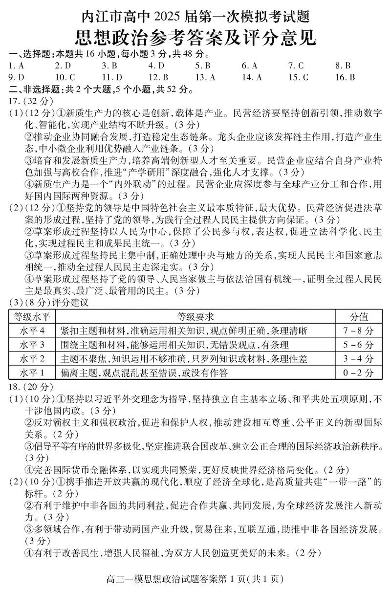 四川内江2025届高三上学期一模政治考试已于近日开考,为方便考生考后及时查看考试情况,查漏补缺、弥补不足,本文整理了试题答案解析相关信息!