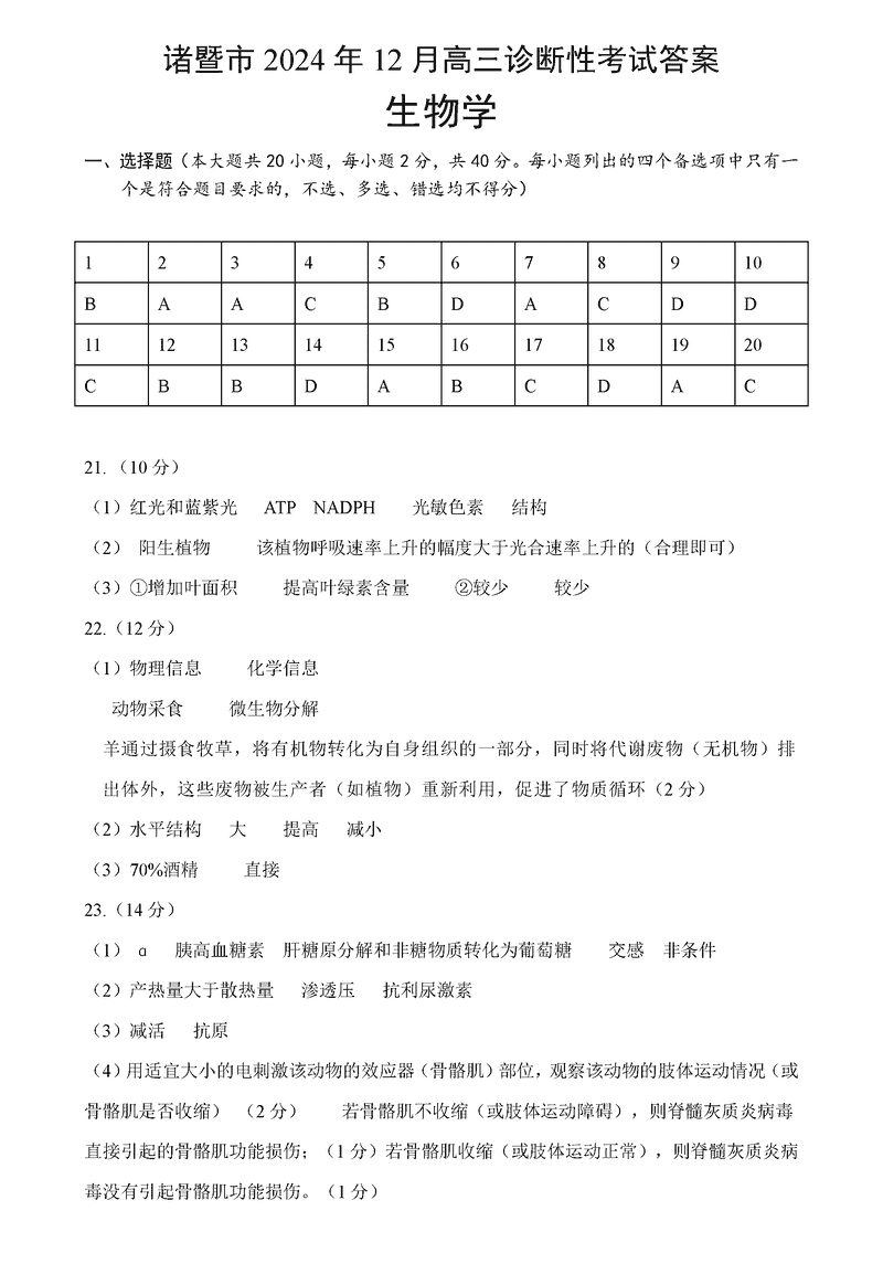 浙江诸暨一模2025届高三上学期12月诊断生物考试已于近日开考,为方便考生考后及时查看考试情况,查漏补缺、弥补不足,本文整理了试题答案解析相关信息!