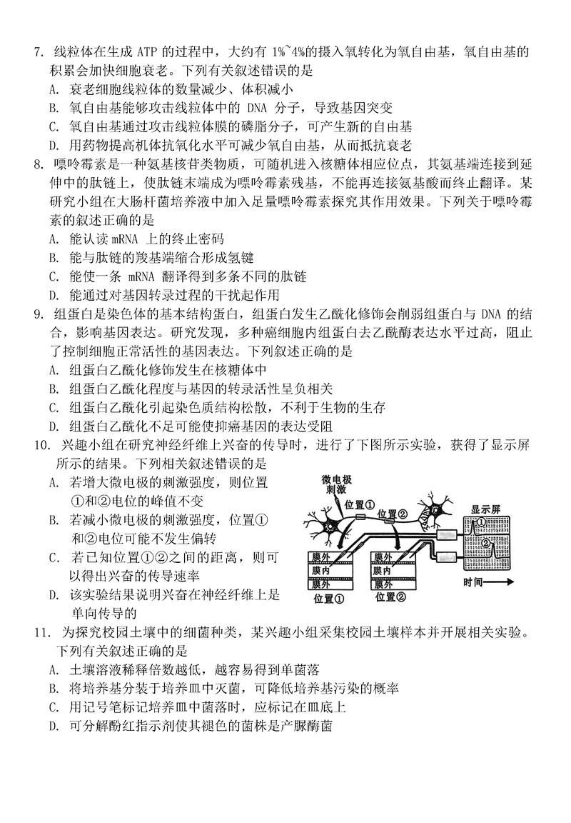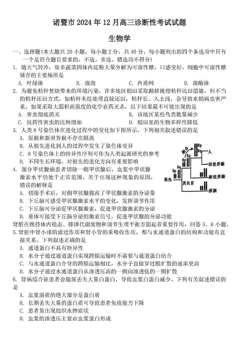 诸暨一模2025届高三上学期12月诊断生物试题及答案