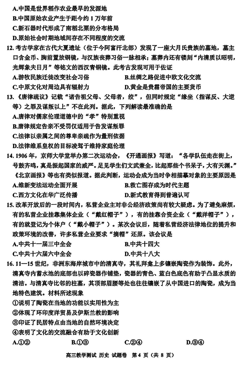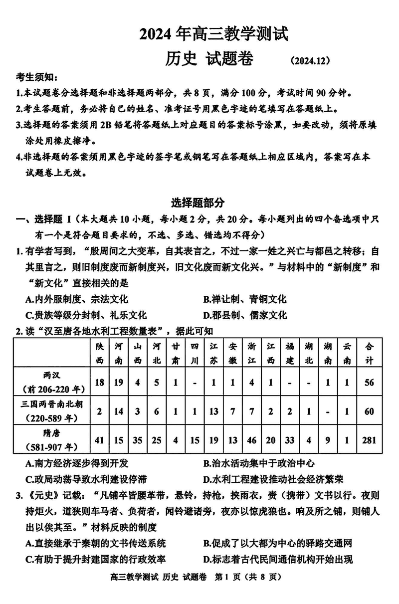 浙江嘉兴一模2024年高三12月教学测试历史试题及答案