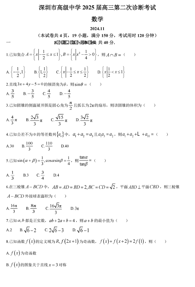 深圳高级中学2024-2025学年高三上学期第二次诊断数学考试已于近日开考,为方便考生考后及时查看考试情况,查漏补缺、弥补不足,本文整理了试题答案解析相关信息!