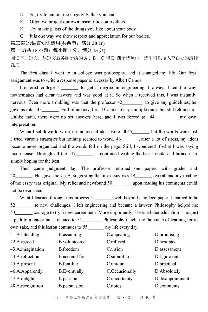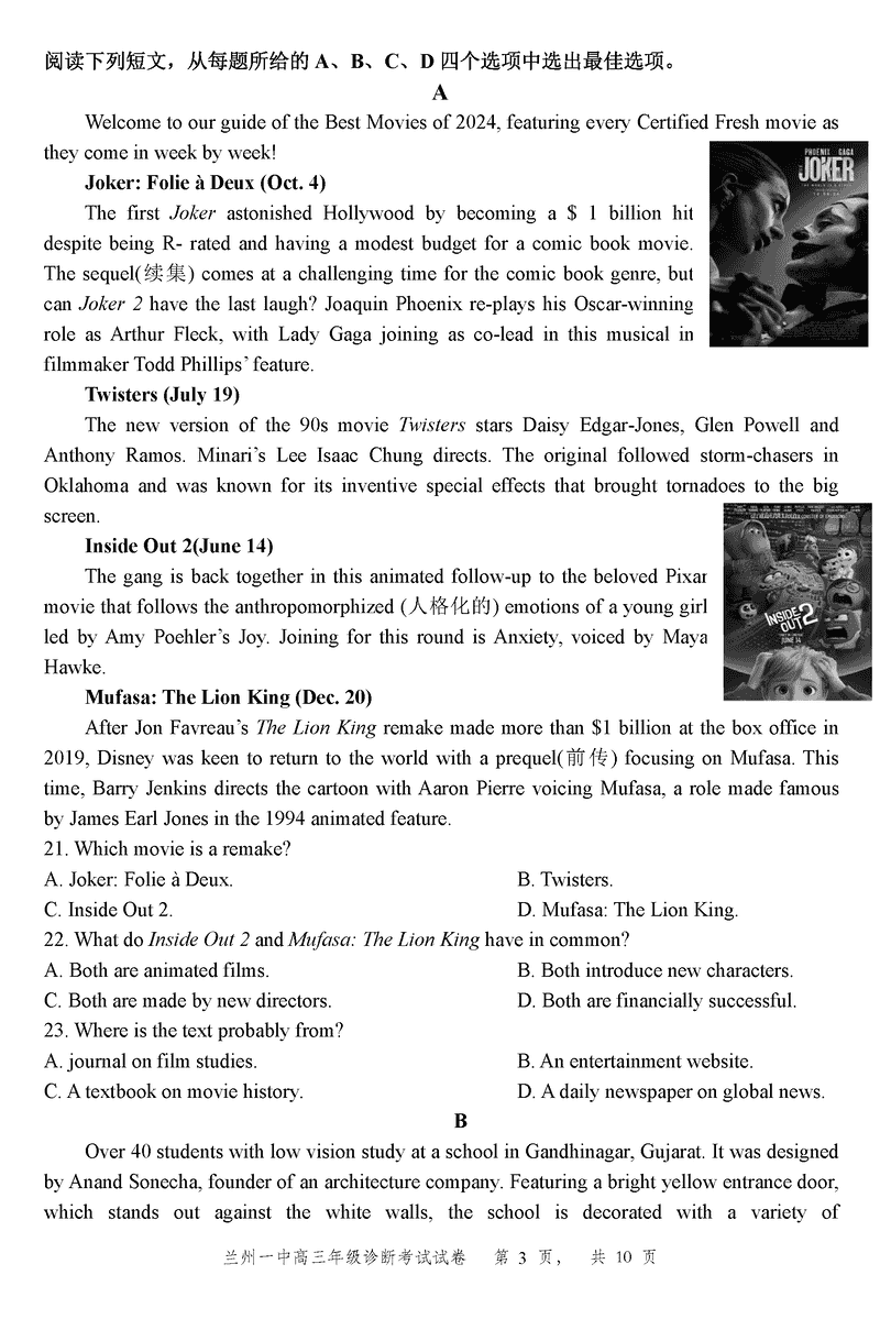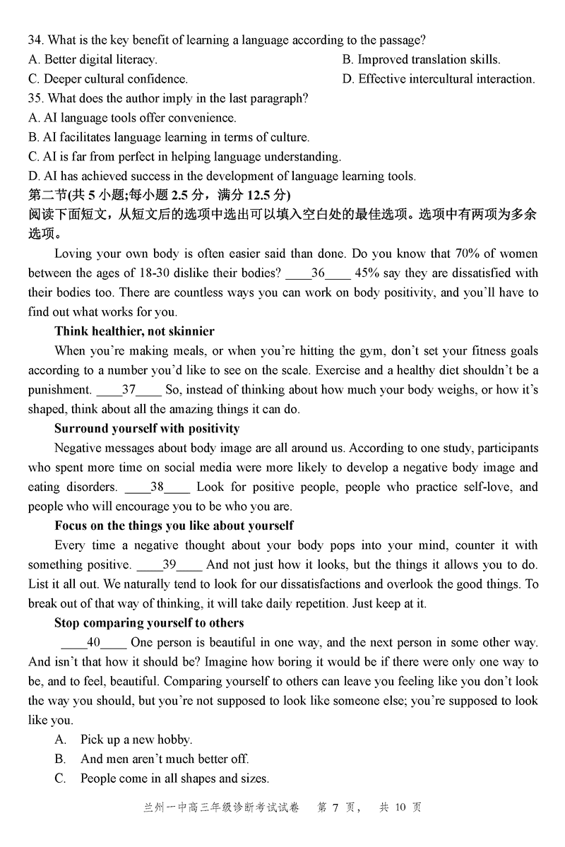 兰州一中2024-2025学年高三上学期12月月考英语考试已于近日开考,为方便考生考后及时查看考试情况,查漏补缺、弥补不足,本文整理了试题答案解析相关信息!