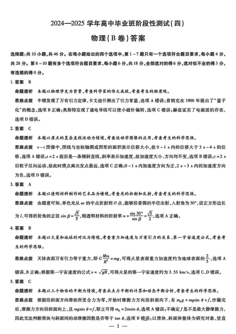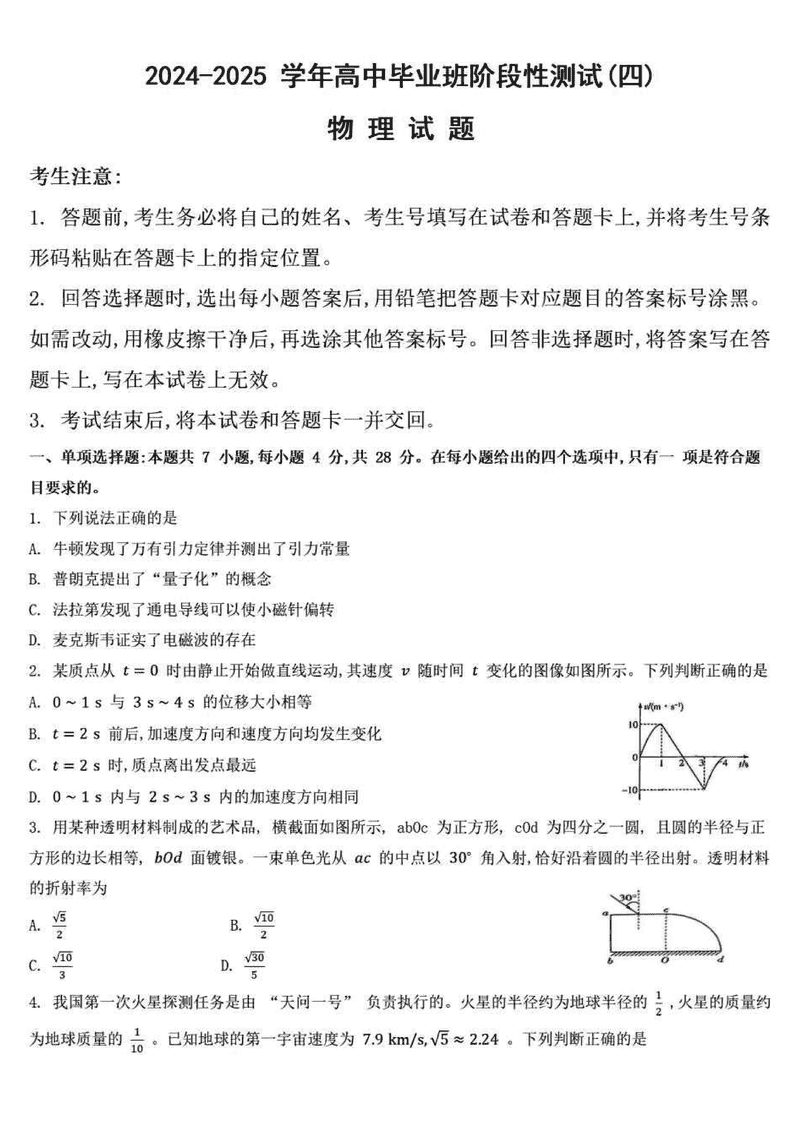 河南天一大联考2024-2025学年高三阶段性测试(四)物理考试已于近日开考,为方便考生考后及时查看考试情况,查漏补缺、弥补不足,本文整理了试题答案解析相关信息!