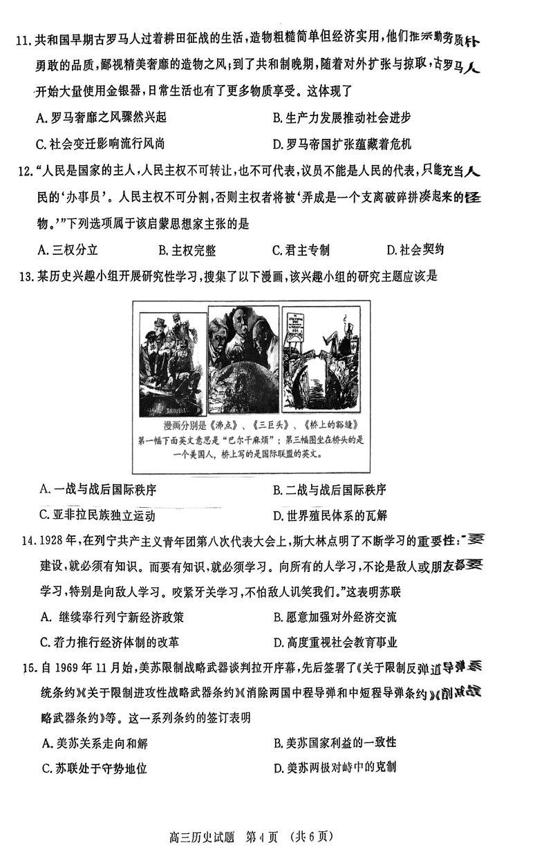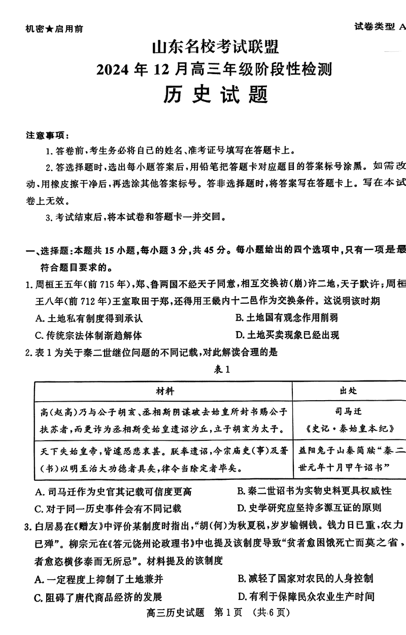 山东名校考试联盟2024年12月高三阶段测历史试题及答案
