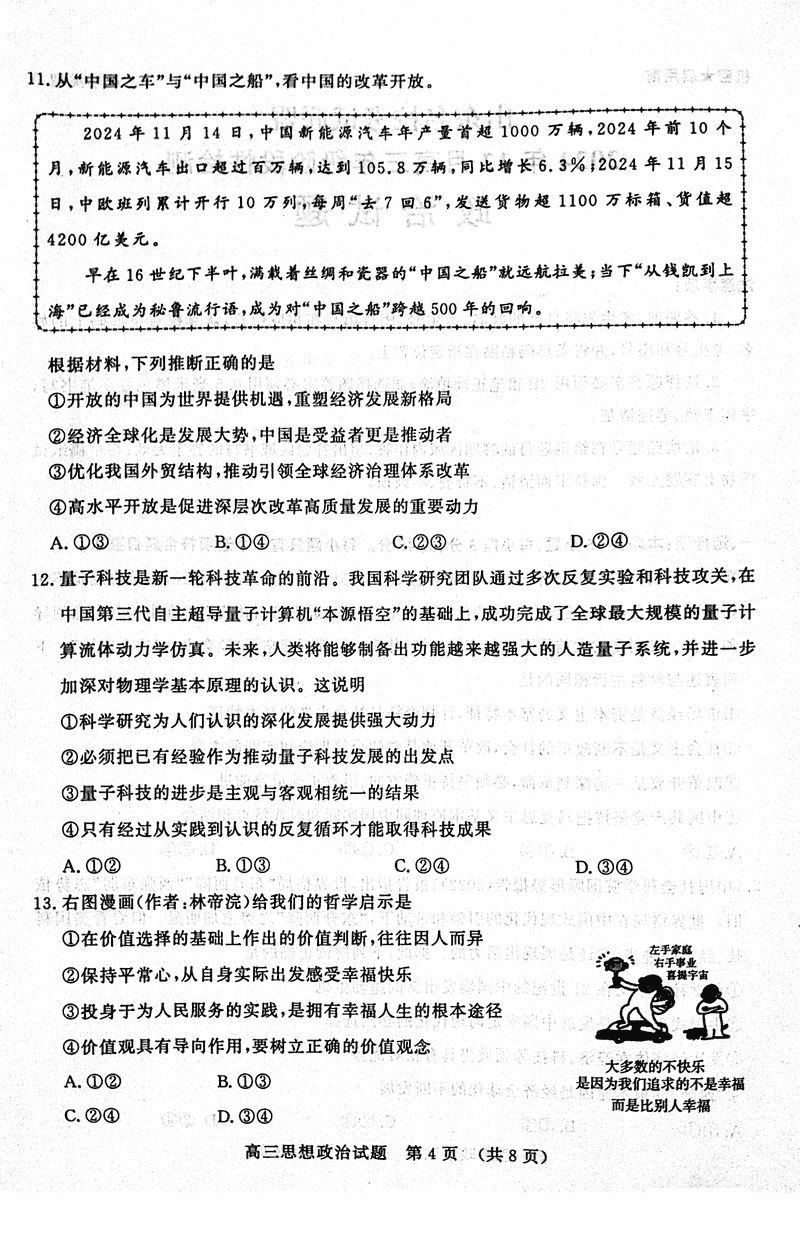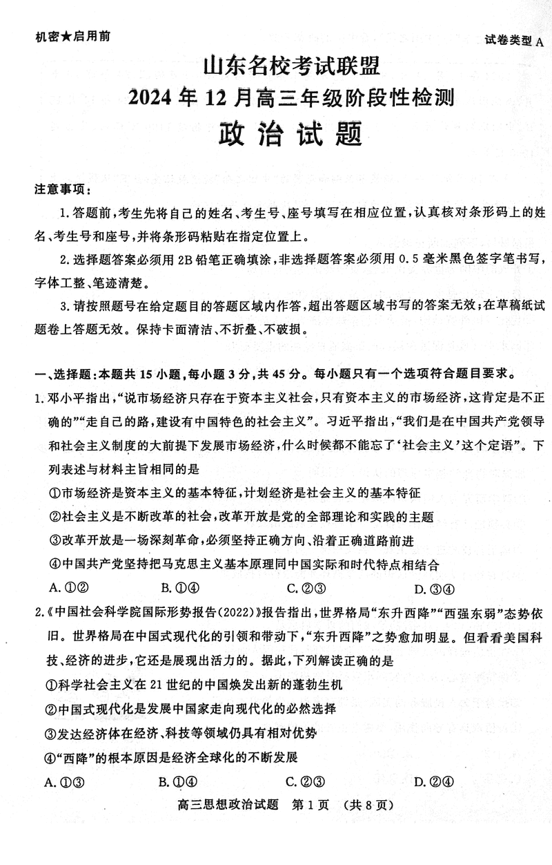 山东名校考试联盟2024年12月高三阶段测政治试题及答案