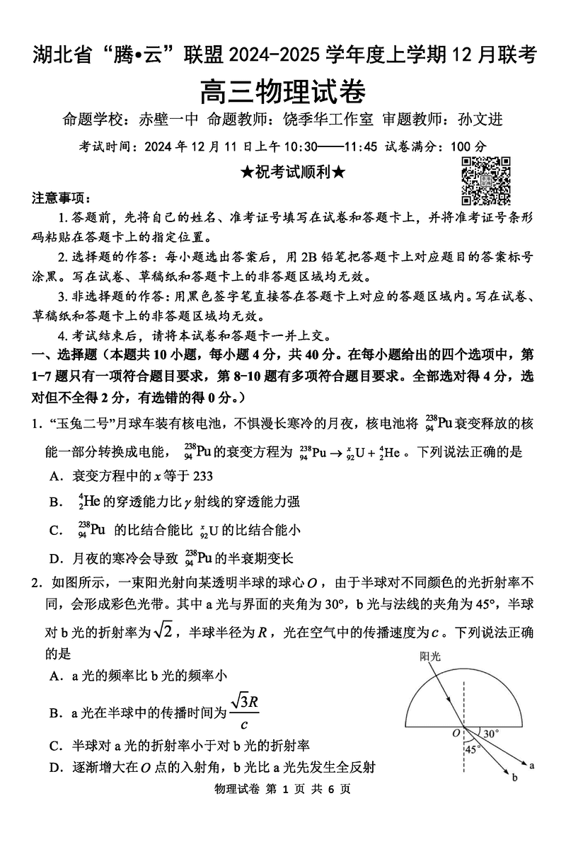 湖北省腾云联盟2025届高三12月联考物理试题及答案 时间:2024-12-12 12:34 湖北 理综试题 湖北省腾云联盟2025届高三12月联考物理考试已于近日开考,为方便考生考后及时查看考试情况,查漏补缺、弥补不足,本文整理了试题答案解析相关信息! 汇总:湖北省腾云联盟2025届高三12月联考试题及答案汇总 物理试题及答案解析