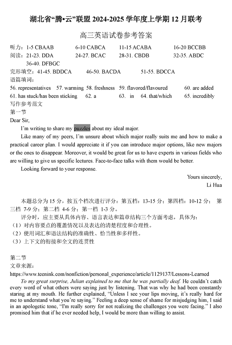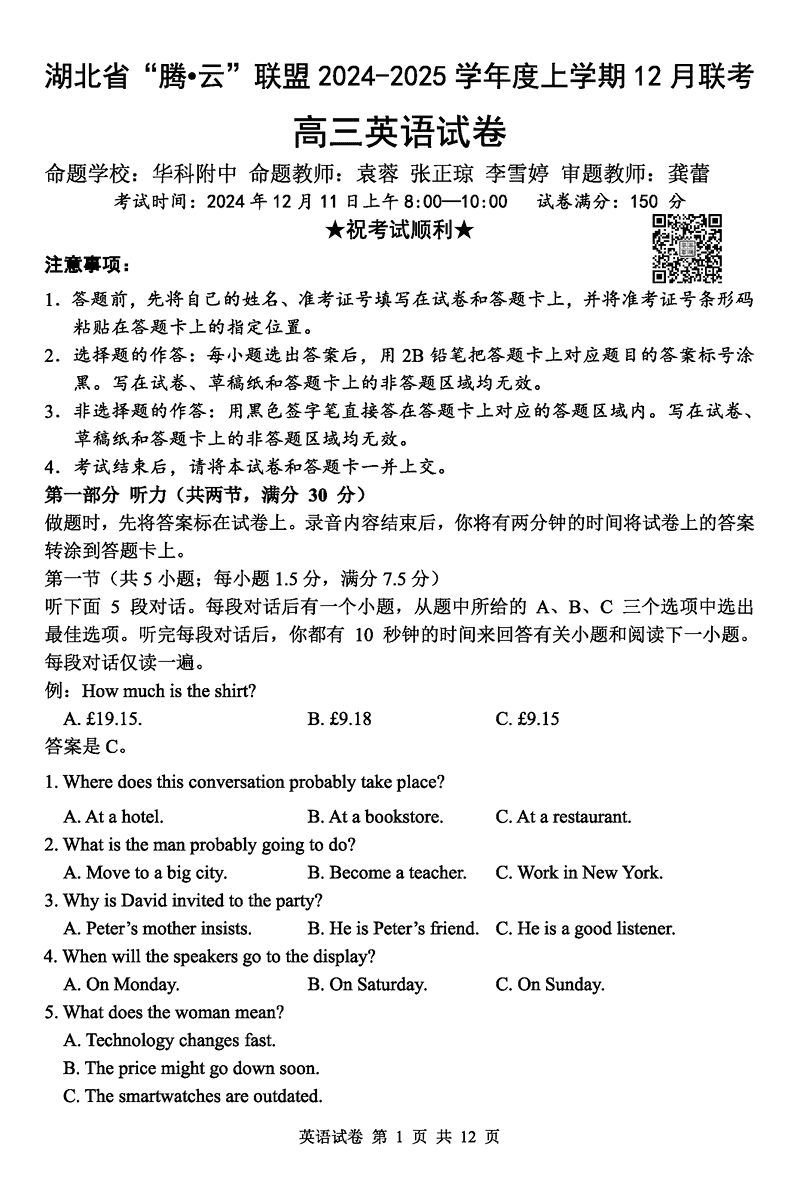 湖北省腾云联盟2025届高三12月联考英语试题及答案 时间:2024-12-12 12:34 湖北 英语试题 湖北省腾云联盟2025届高三12月联考英语考试已于近日开考,为方便考生考后及时查看考试情况,查漏补缺、弥补不足,本文整理了试题答案解析相关信息! 汇总:湖北省腾云联盟2025届高三12月联考试题及答案汇总 英语试题及答案解析