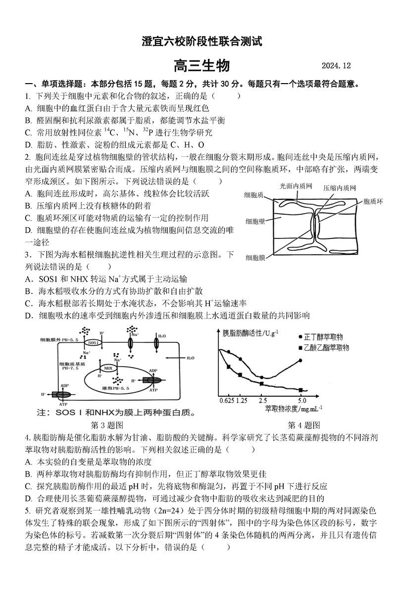 无锡澄宜六校2025届高三上学期12月联考生物试题及答案