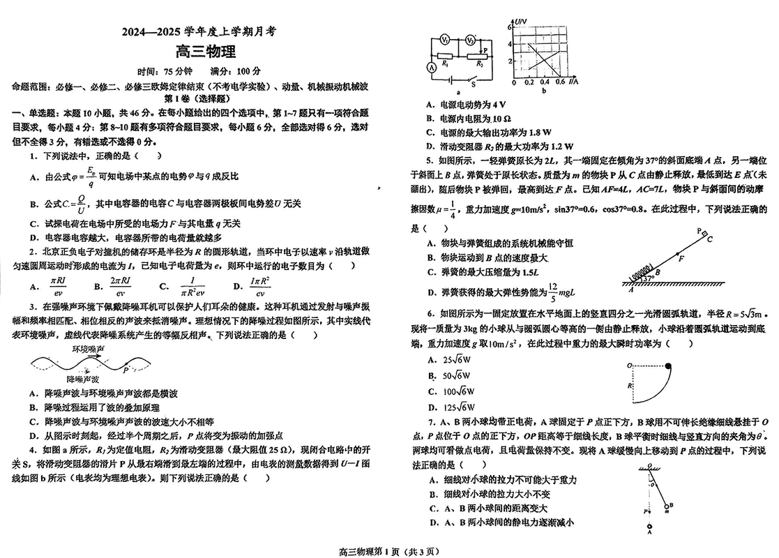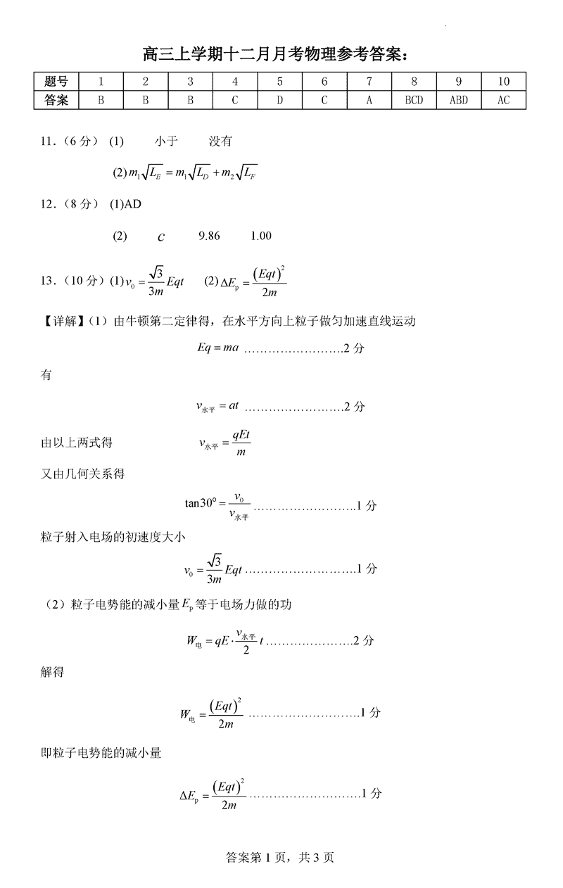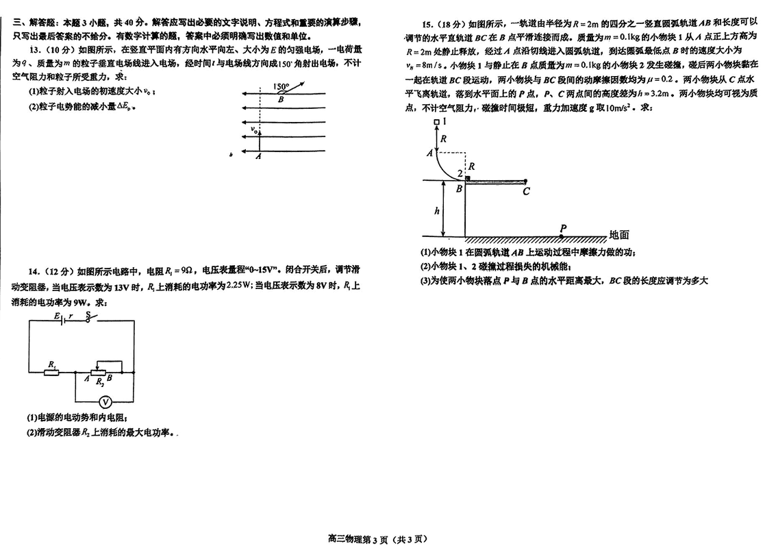 鞍山市普通高中2025届高三上第三次月考物理试题及答案