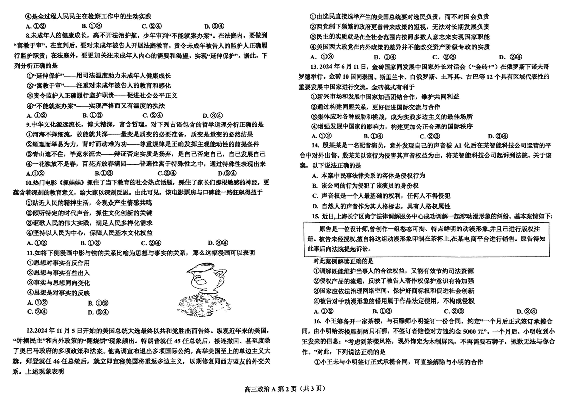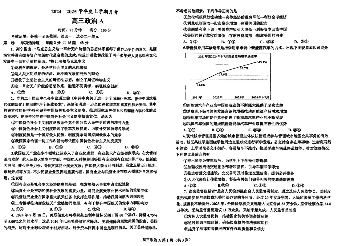 鞍山市普通高中2025届高三上第三次月考政治试题及答案