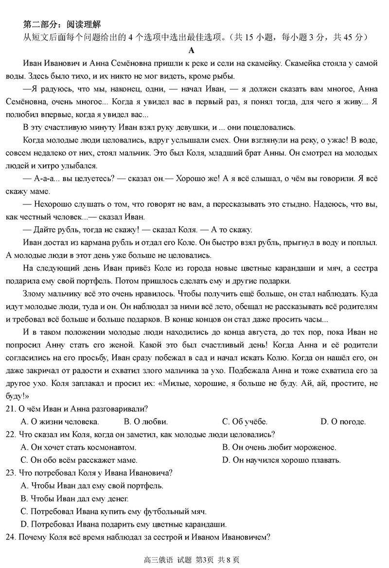 浙江精诚联盟2024学年12月高三上联考俄语试题及答案
