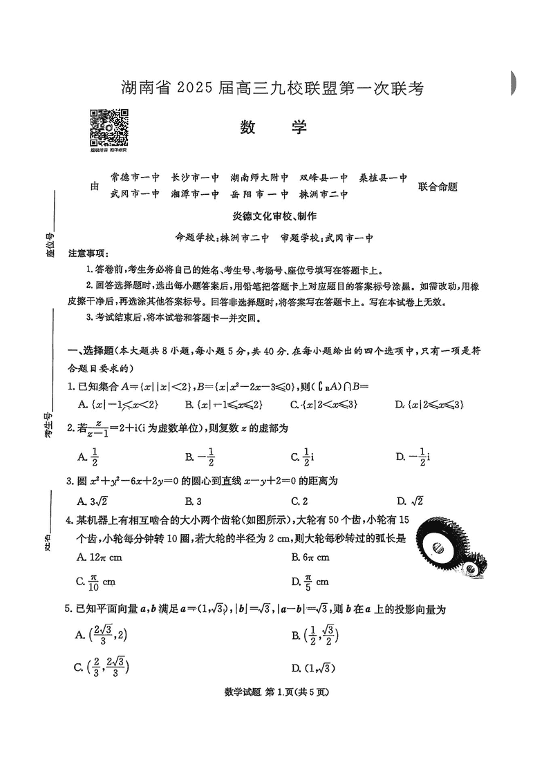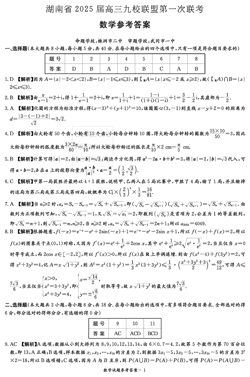 湖南九校联盟2025届高三上第一次联考数学试题及答案 时间:2024-12-17 05:38 湖南 数学试题 湖南九校联盟2025届高三上第一次联考数学考试已于近日开考,为方便考生考后及时查看考试情况,查漏补缺、弥补不足,本文整理了试题答案解析相关信息! 汇总:湖南九校联盟2025届高三上第一次联考试题及答案汇总 数学试题及答案解析