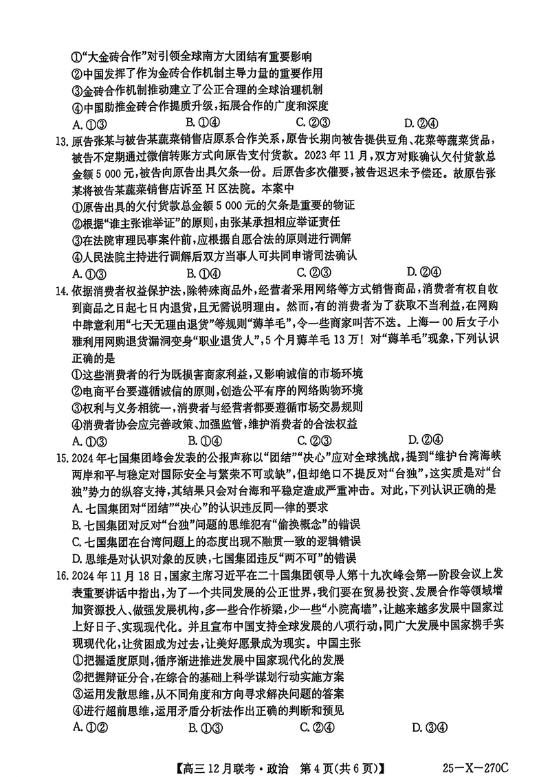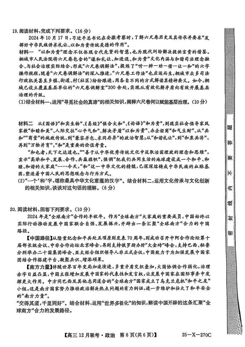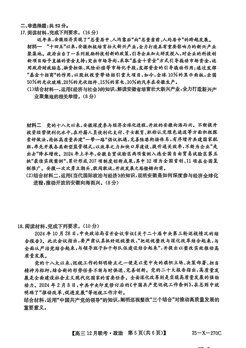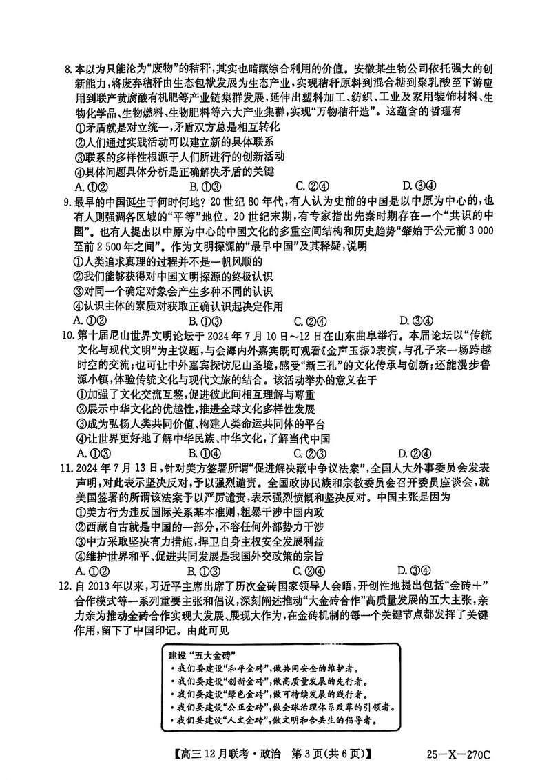 安徽省县中联盟2024-2025学年高三上12月联考政治试题及答案