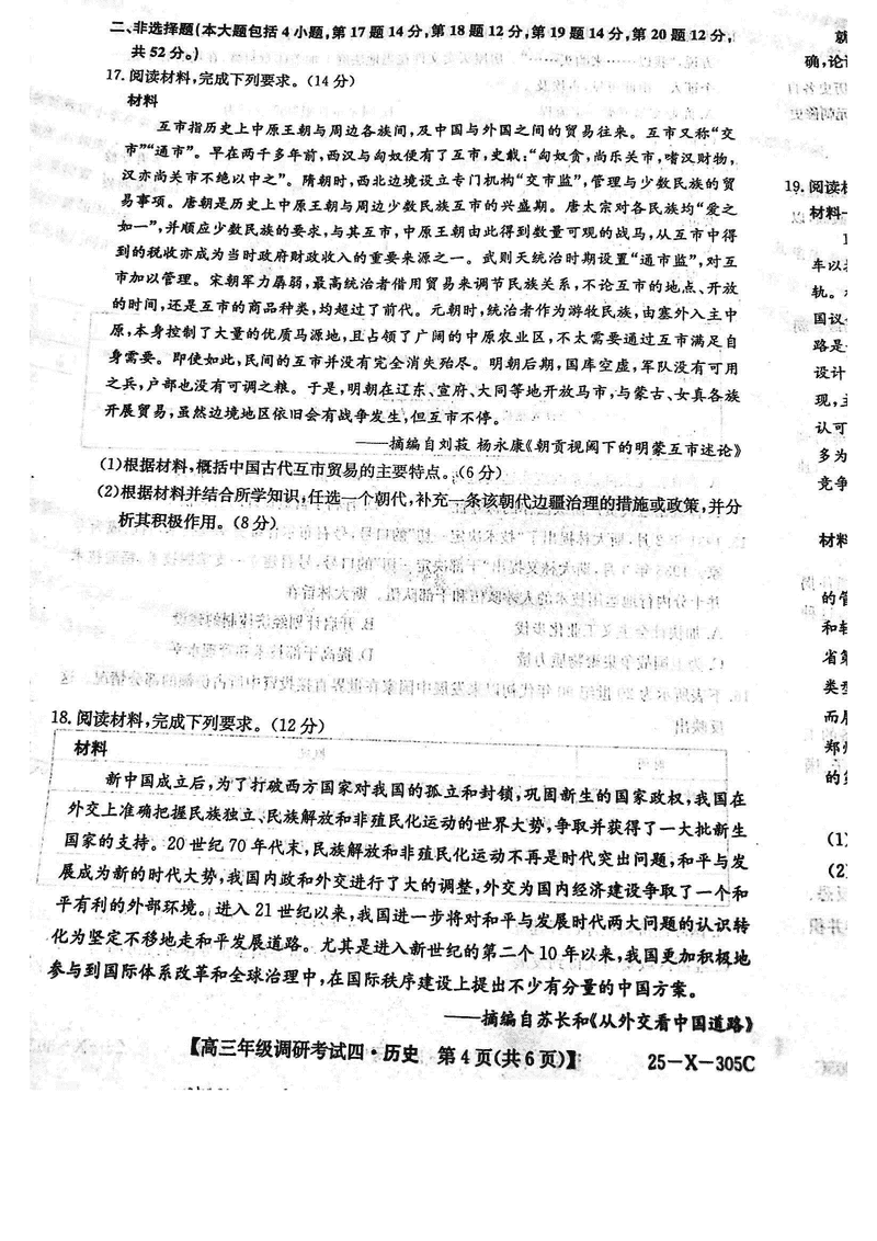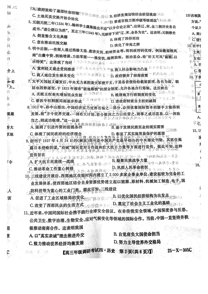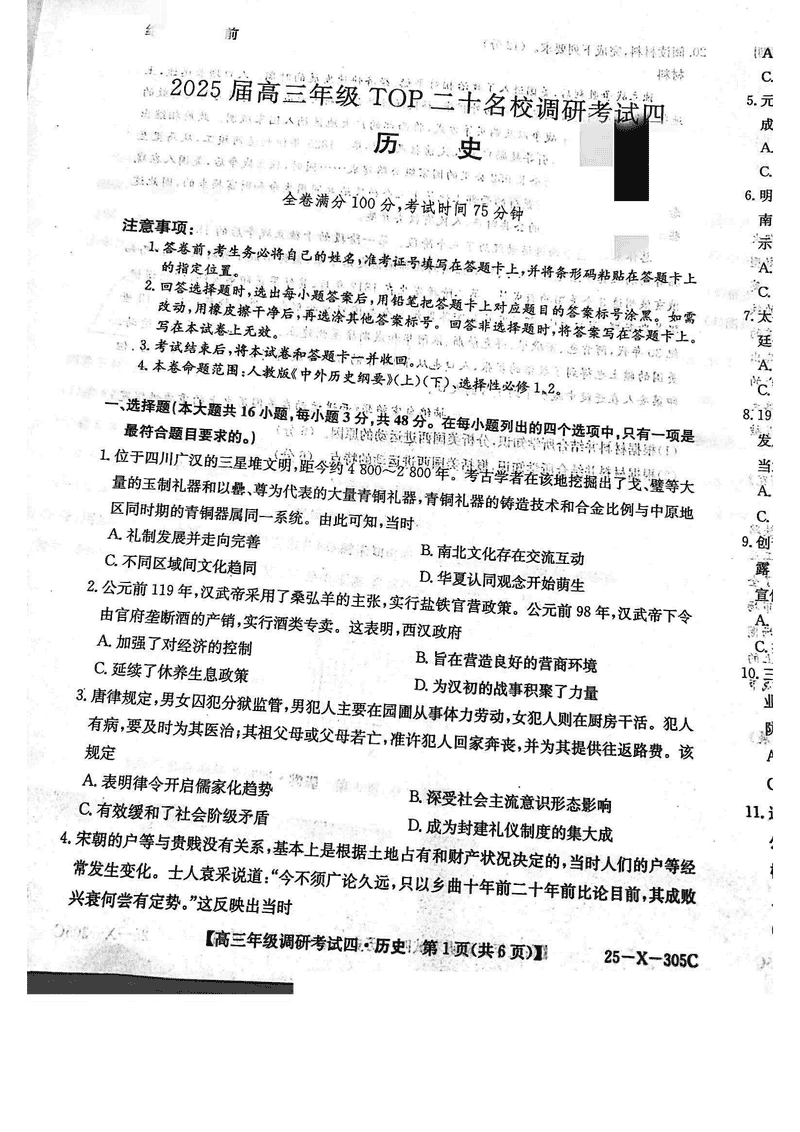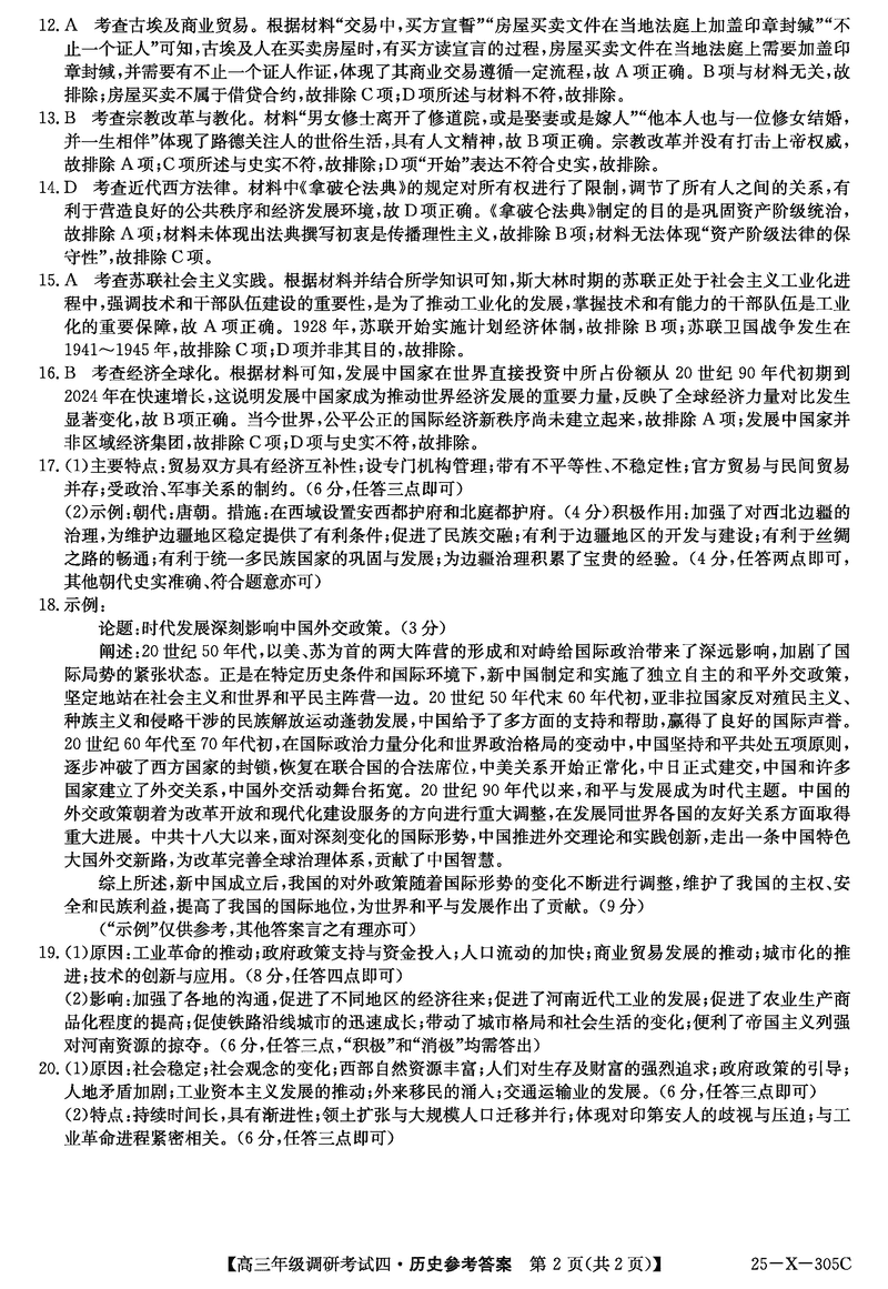 河南TOP20名校2025届高三上调研四历史试题及答案