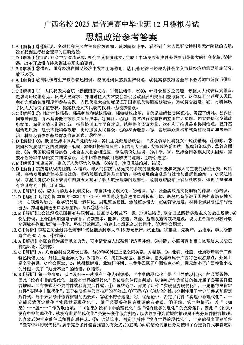 广西名校2025届高中毕业班12月模拟考政治考试已于近日开考,为方便考生考后及时查看考试情况,查漏补缺、弥补不足,本文整理了试题答案解析相关信息!