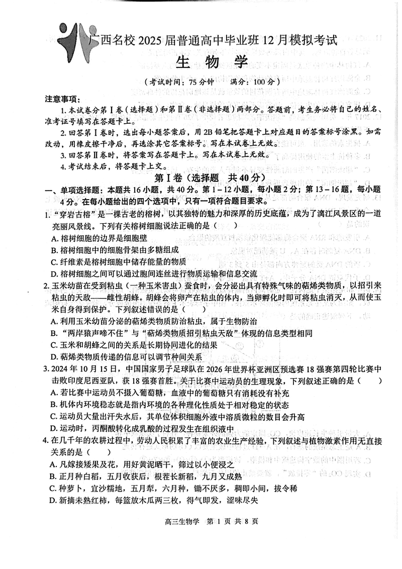 广西名校2025届高中毕业班12月模拟考生物考试已于近日开考,为方便考生考后及时查看考试情况,查漏补缺、弥补不足,本文整理了试题答案解析相关信息!