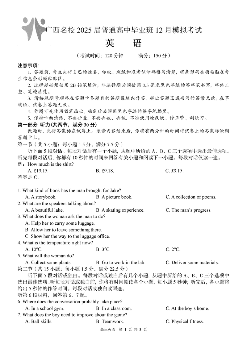 广西名校2025届高中毕业班12月模拟考英语考试已于近日开考,为方便考生考后及时查看考试情况,查漏补缺、弥补不足,本文整理了试题答案解析相关信息!