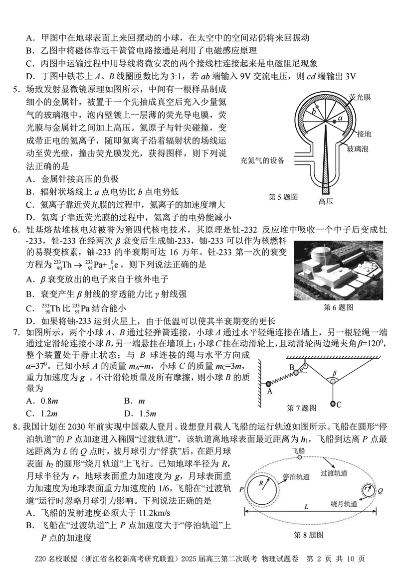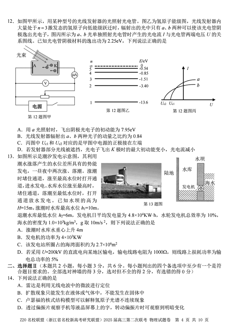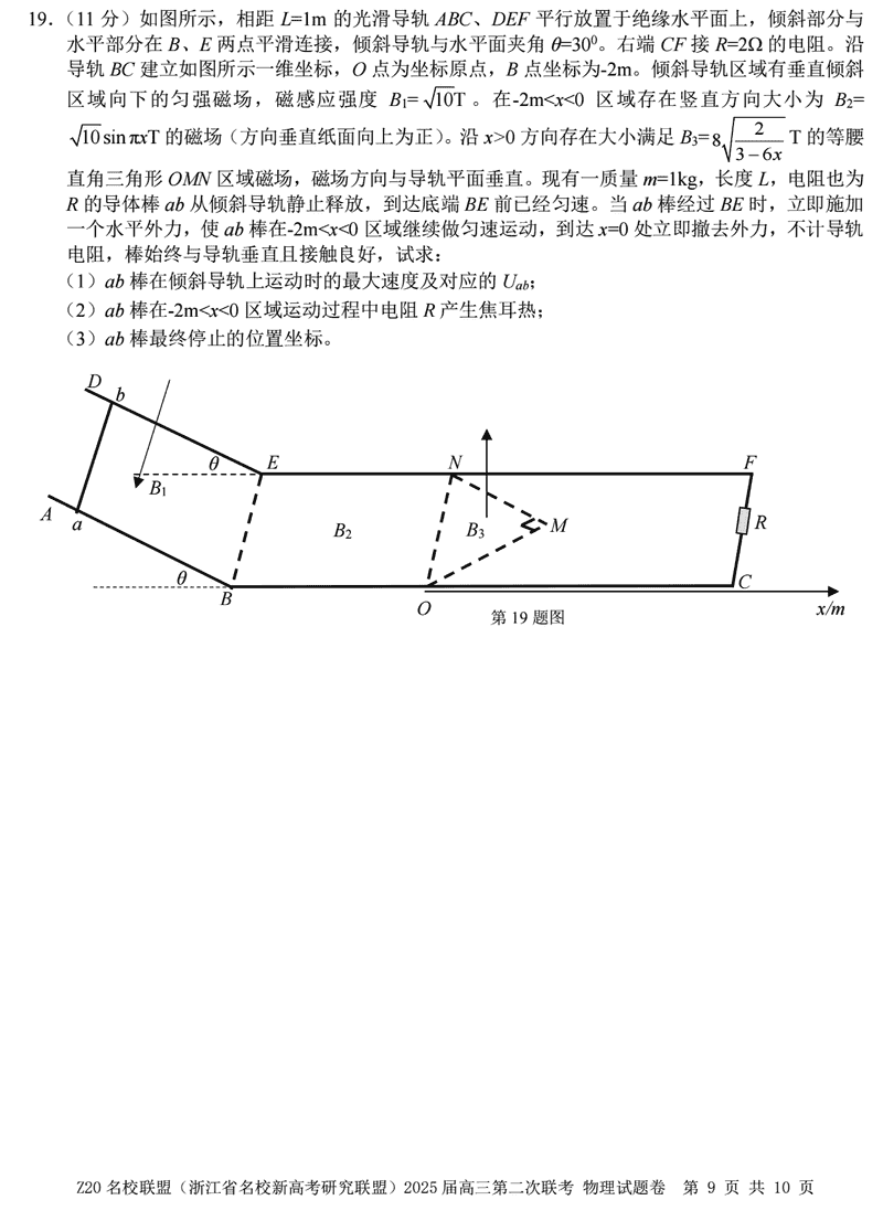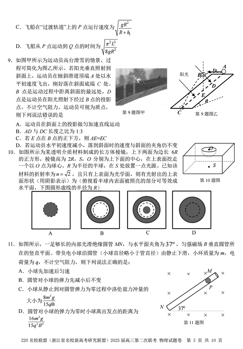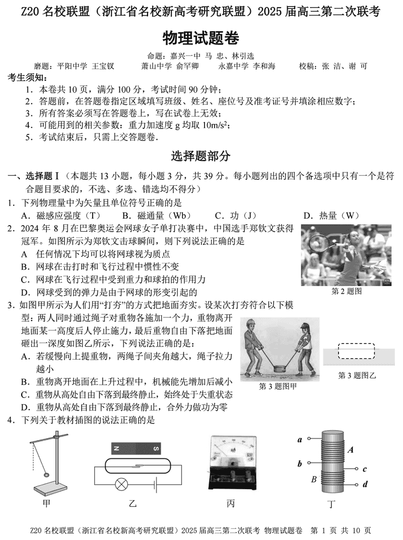 浙江Z20名校联盟2025届高三上学期第二次联考物理试题及答案