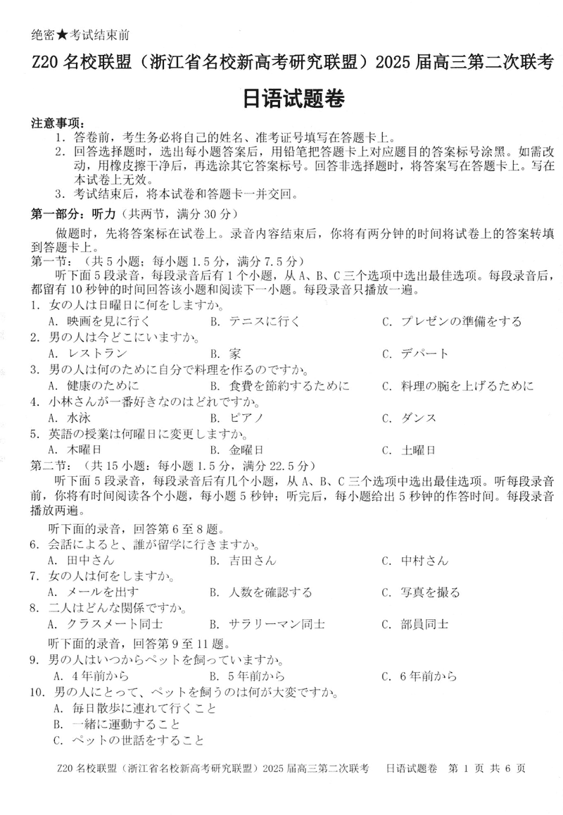 浙江Z20名校联盟2025届高三上学期第二次联考日语考试已于近日开考,为方便考生考后及时查看考试情况,查漏补缺、弥补不足,本文整理了试题答案解析相关信息!