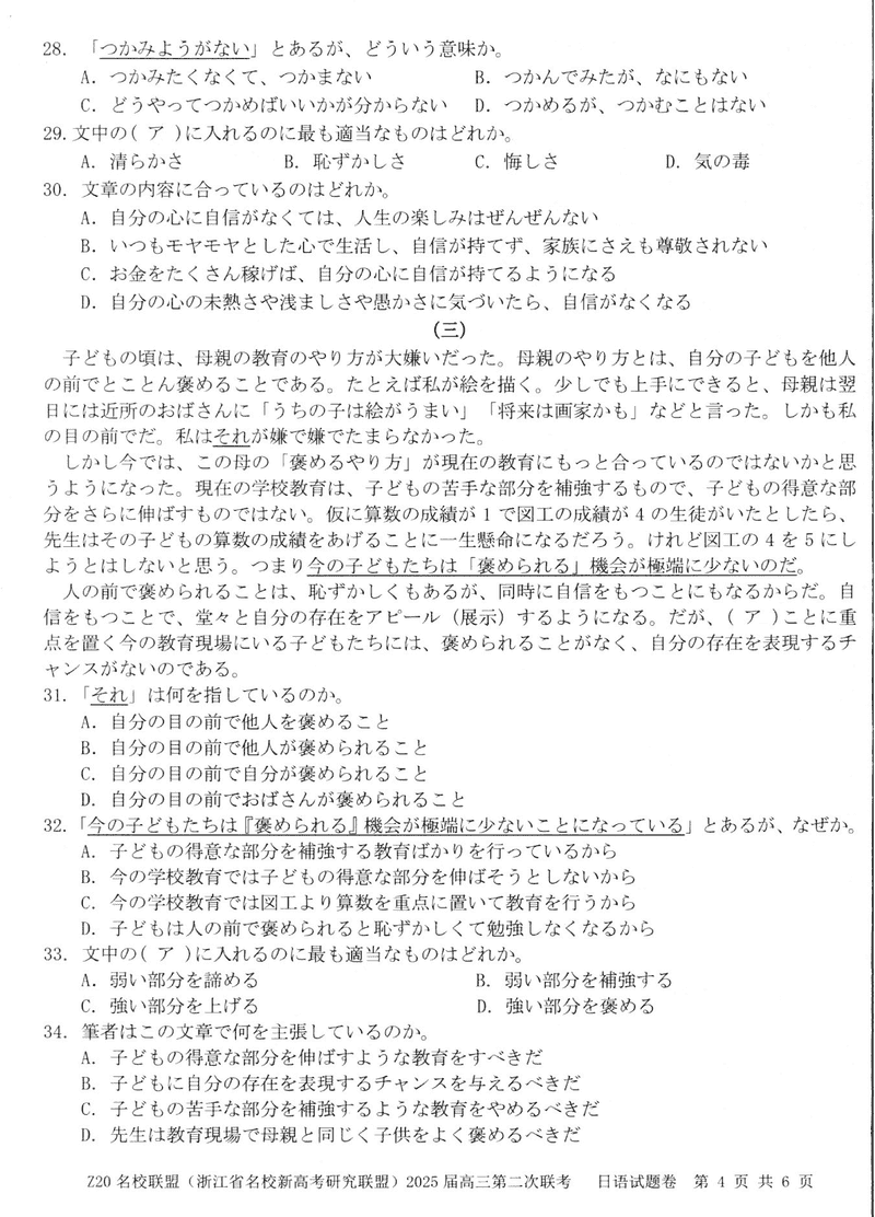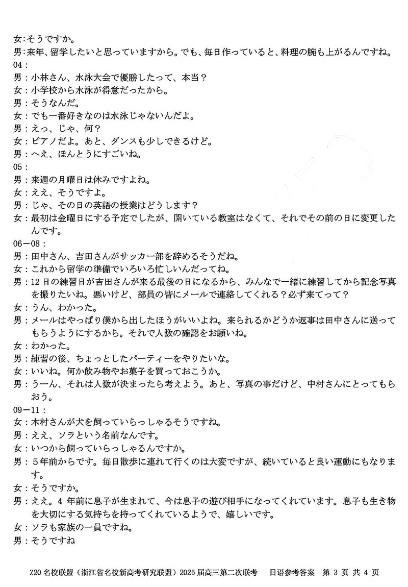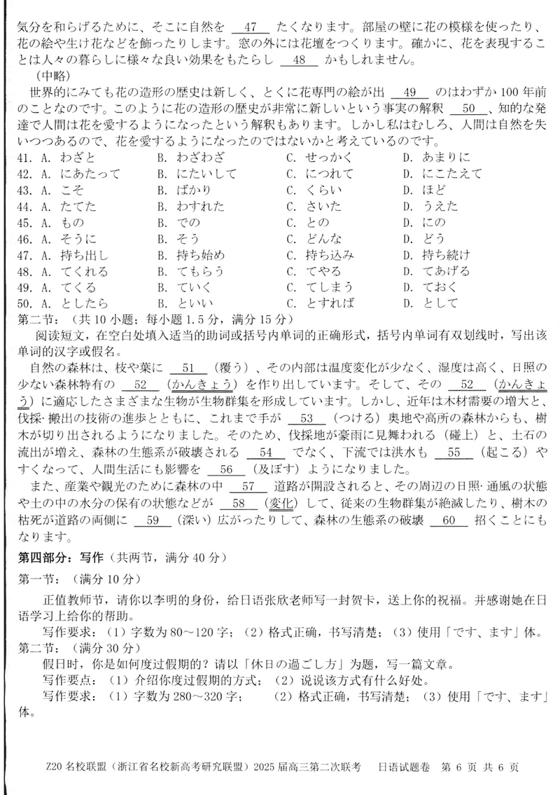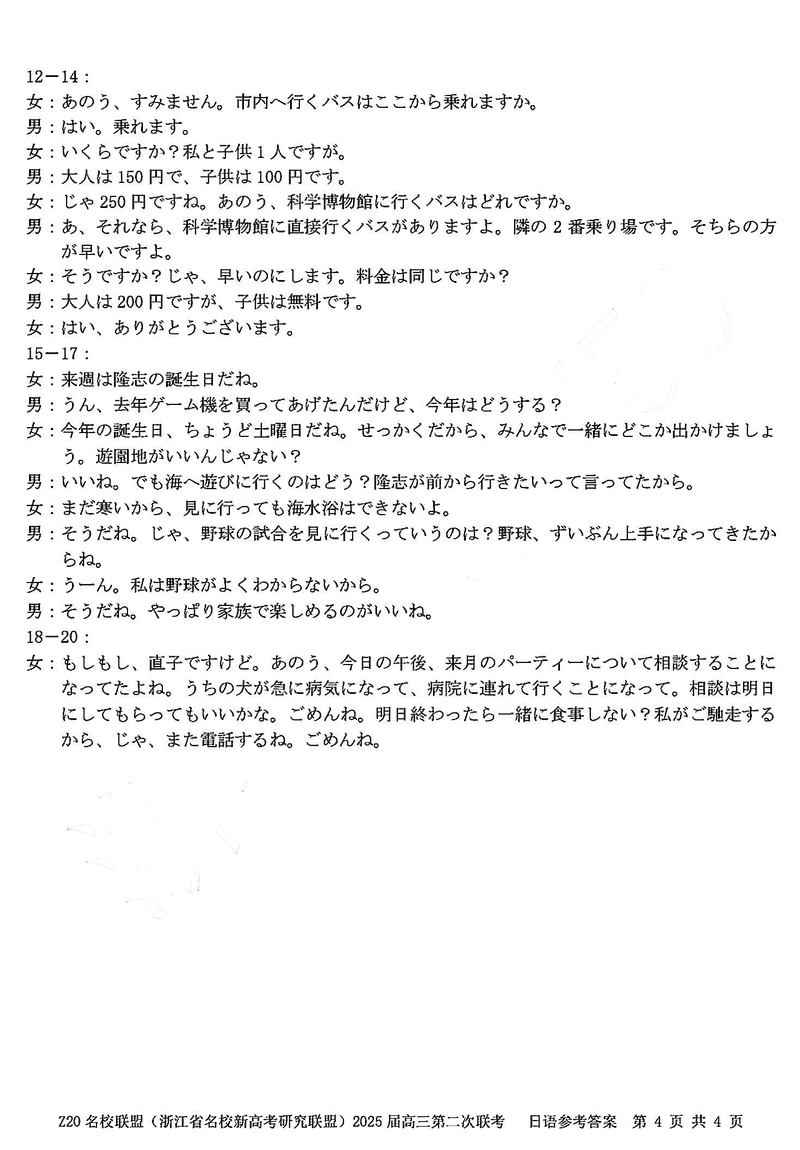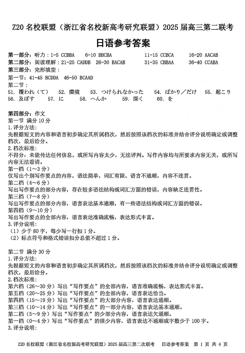 浙江Z20名校联盟2025届高三上学期第二次联考日语试题及答案