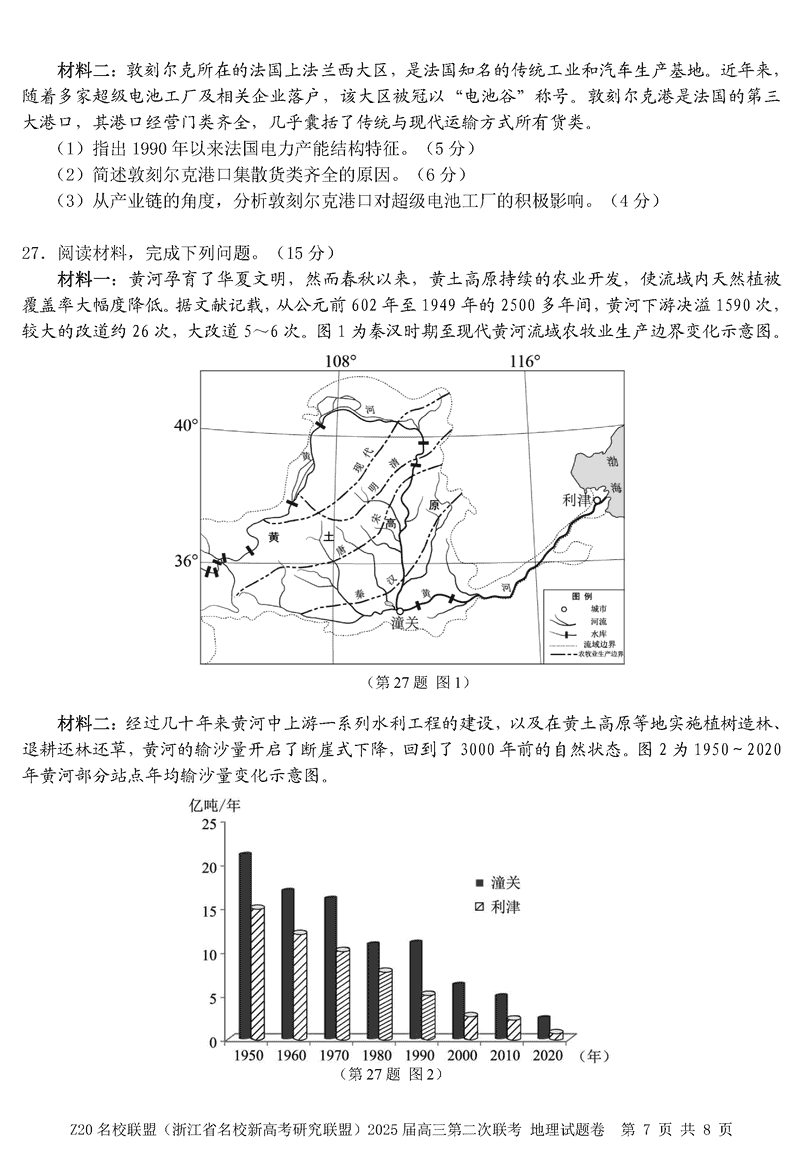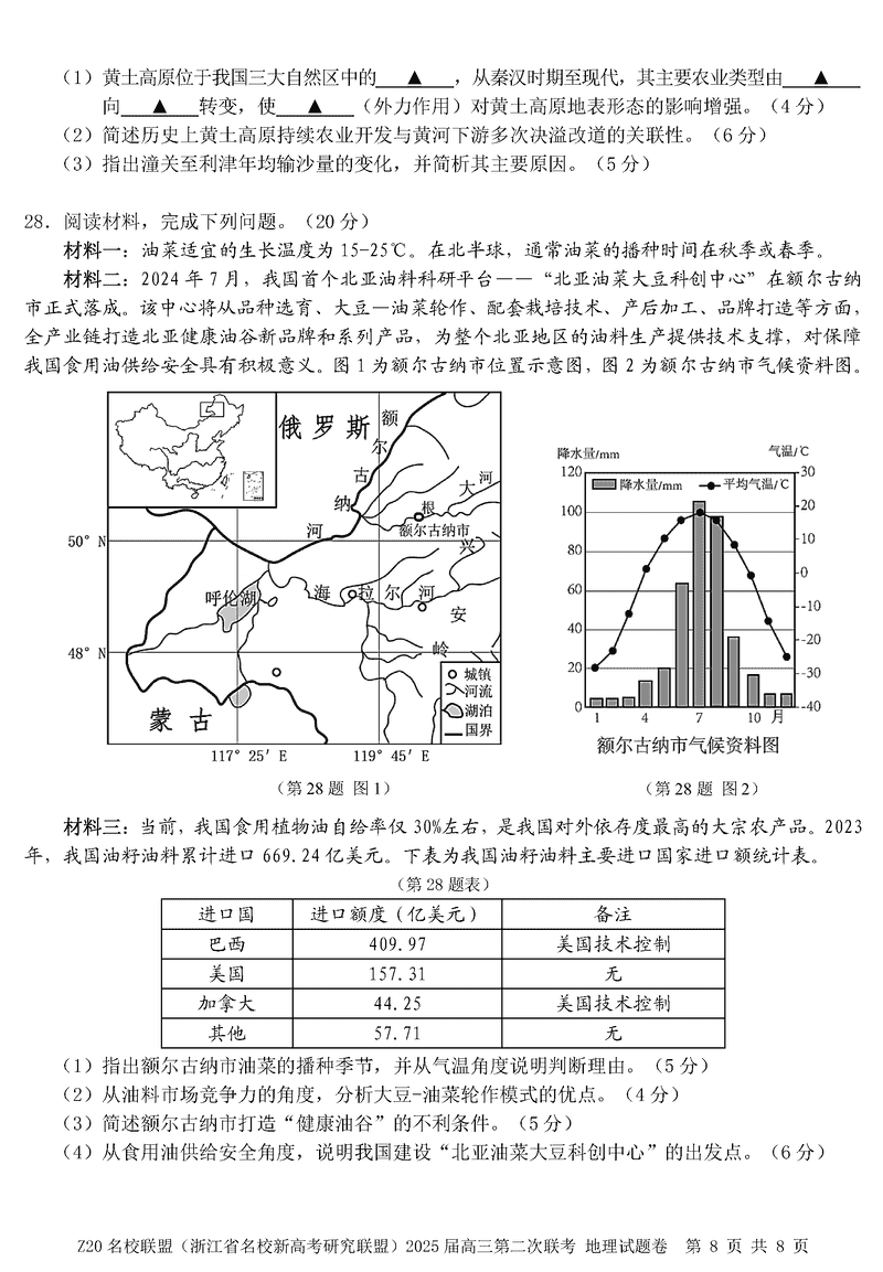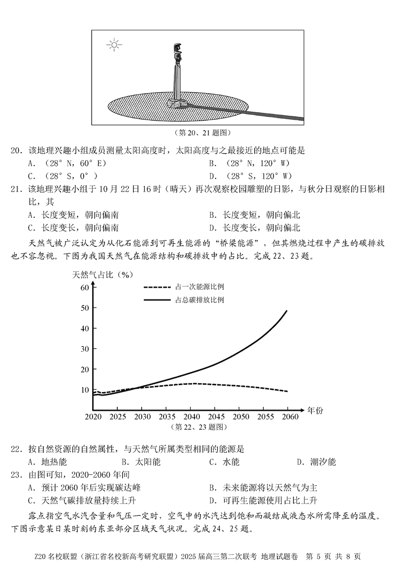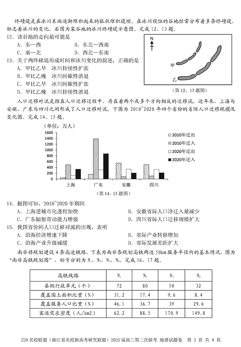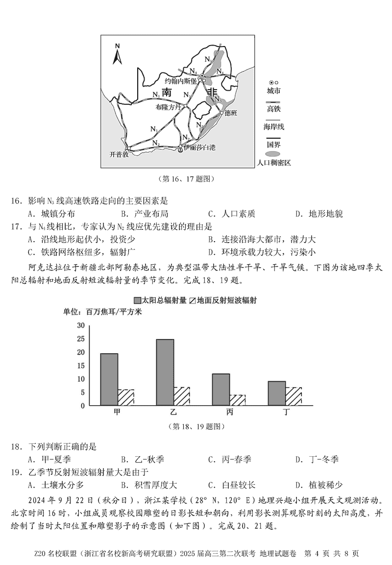 浙江Z20名校联盟2025届高三上学期第二次联考地理试题及答案