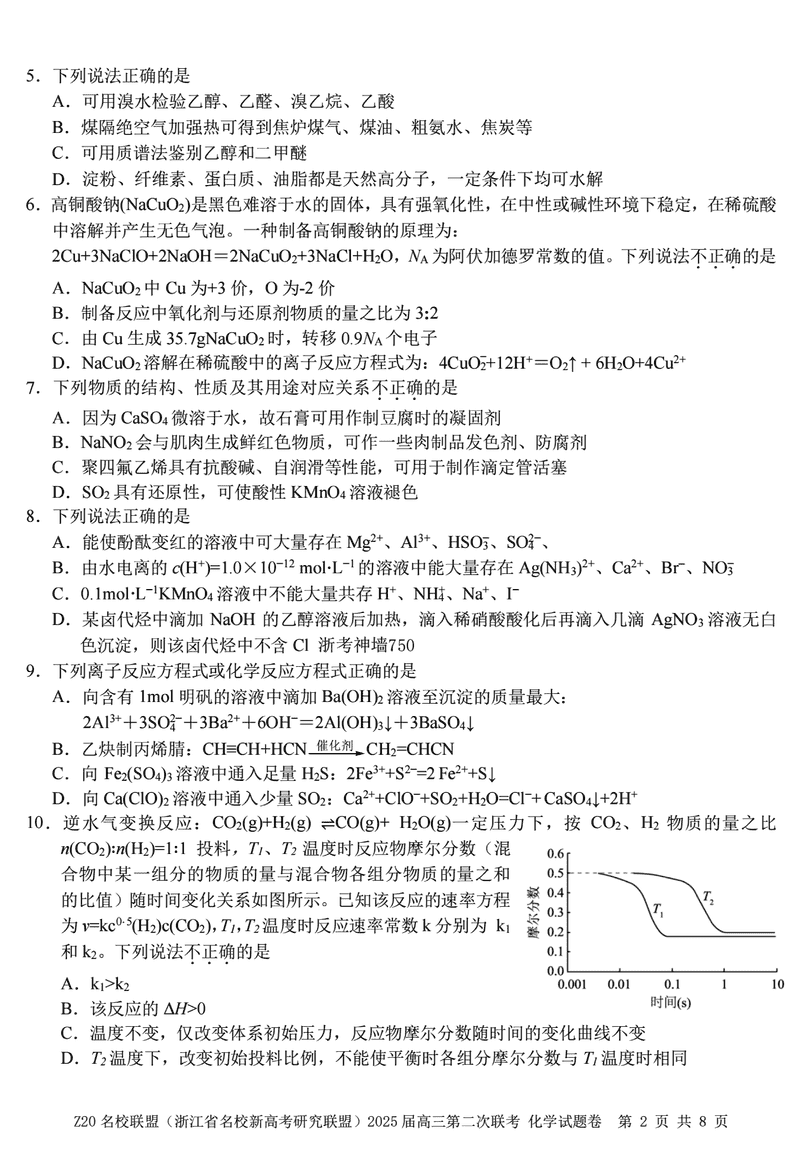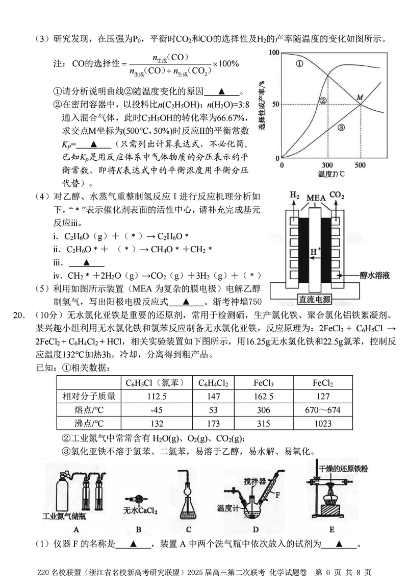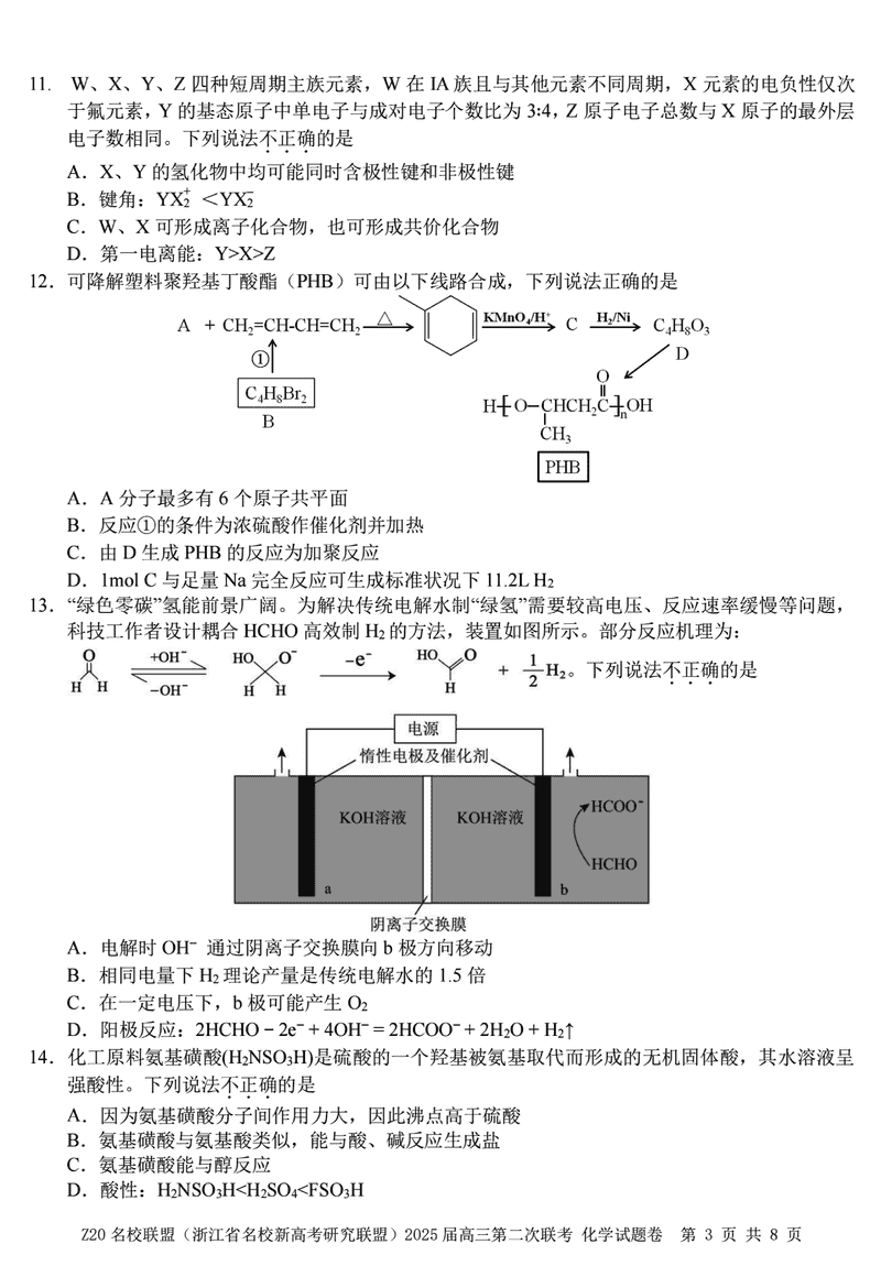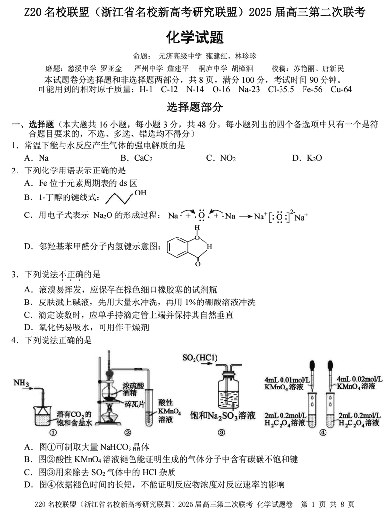 浙江Z20名校联盟2025届高三上学期第二次联考化学试题及答案