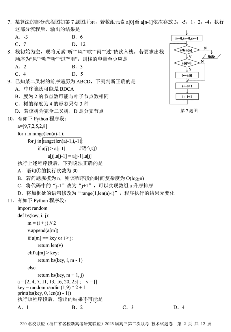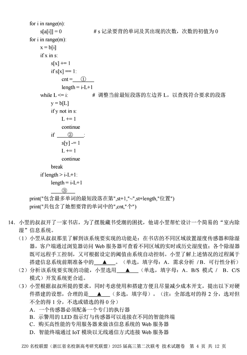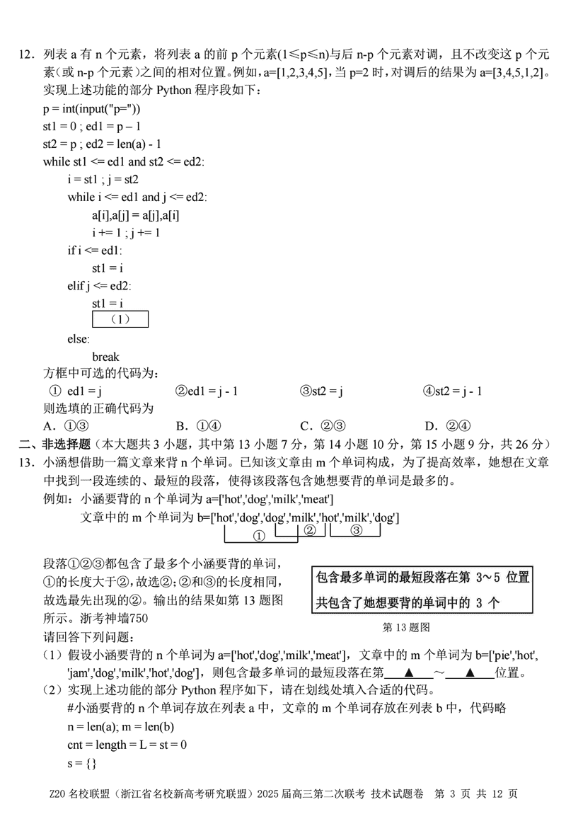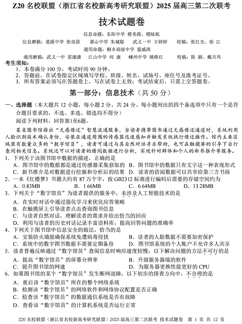 浙江Z20名校联盟2025届高三上学期第二次联考技术试题及答案