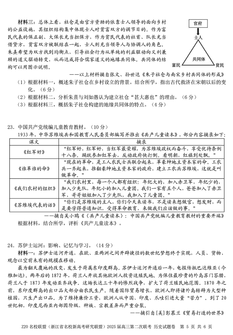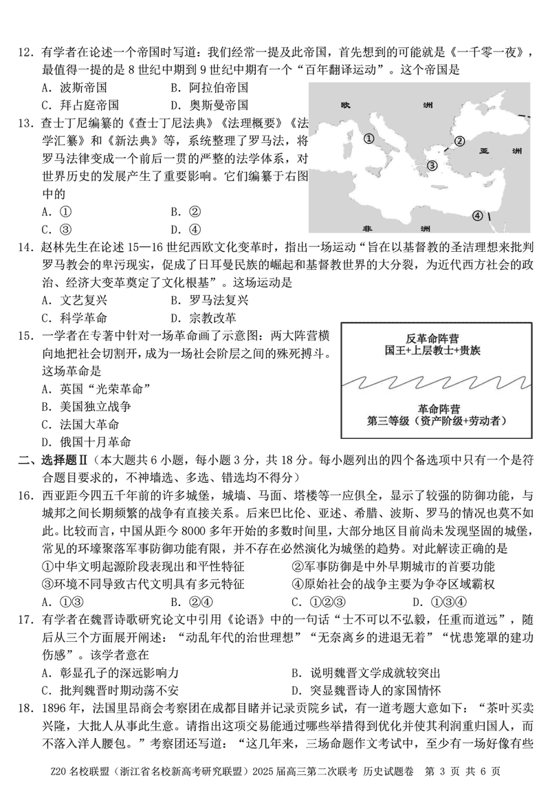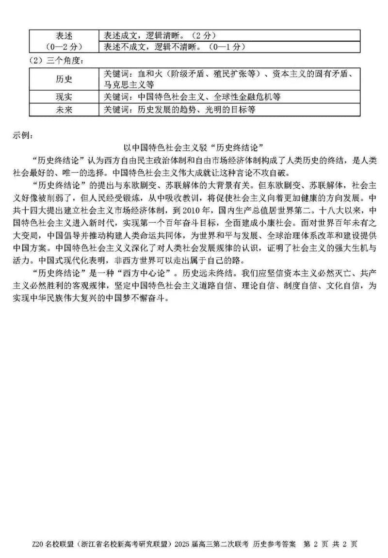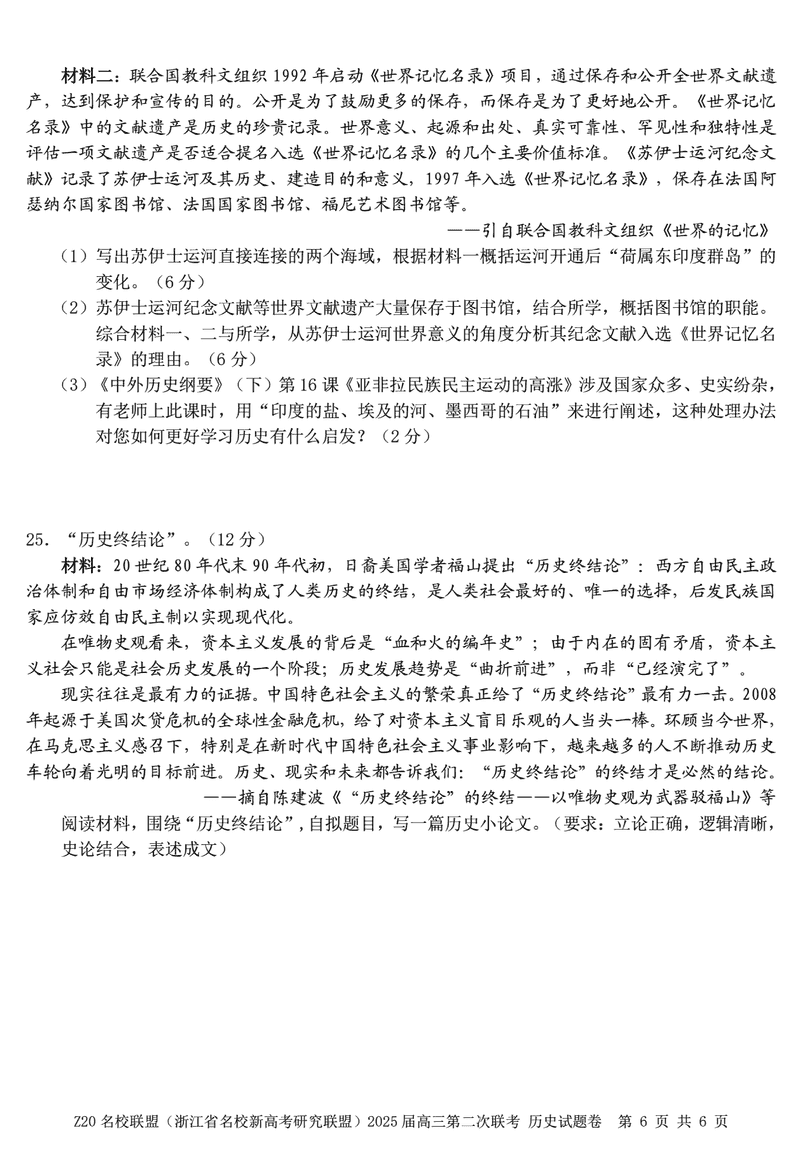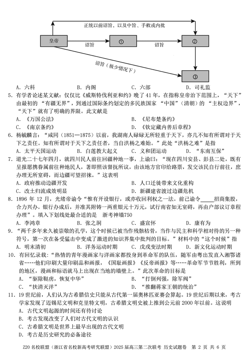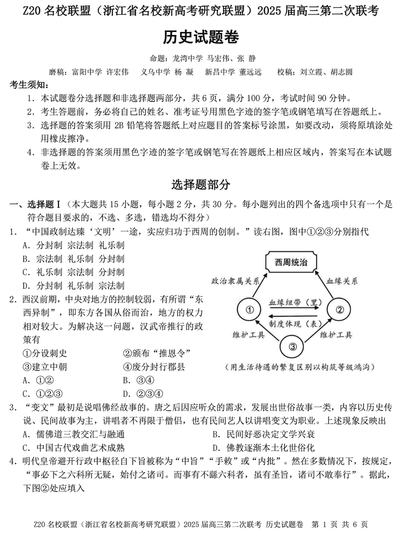 浙江Z20名校联盟2025届高三上学期第二次联考历史试题及答案