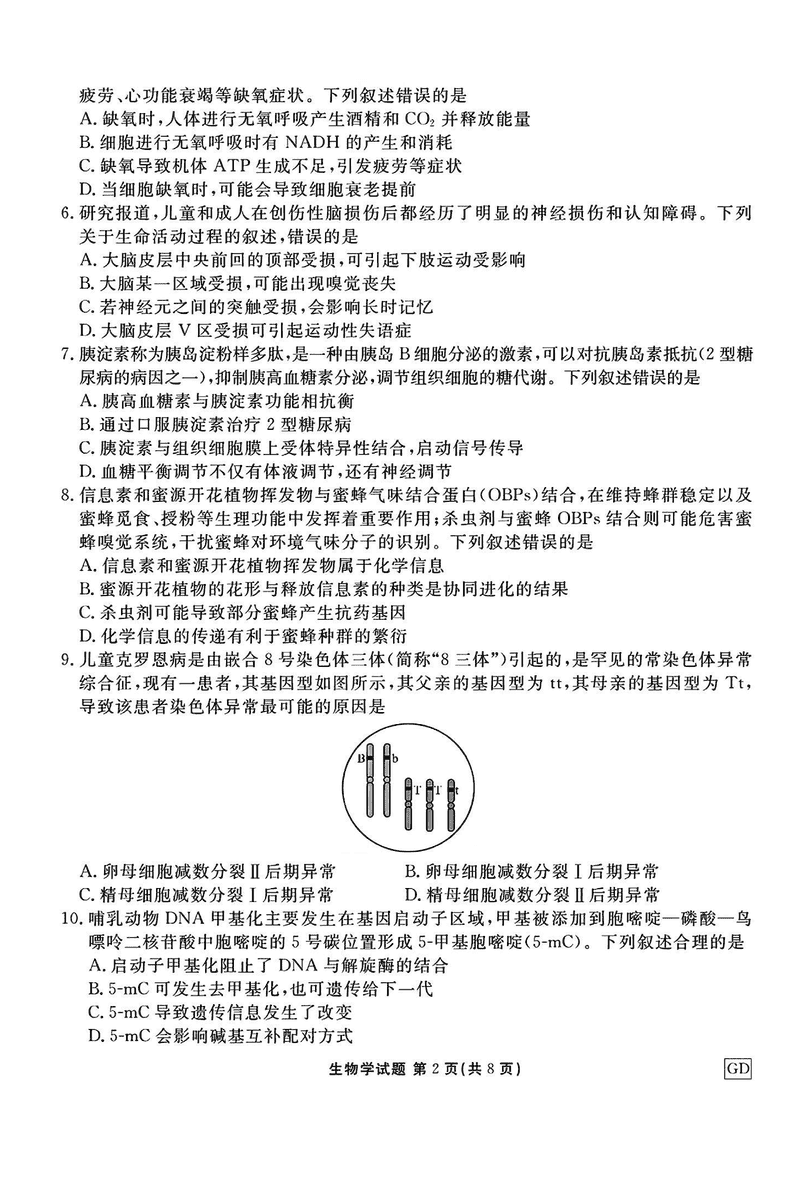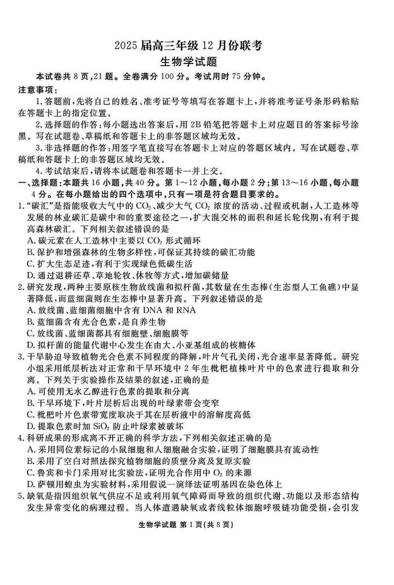 广东衡水金卷2025届高三上学期12月联考生物试题及答案