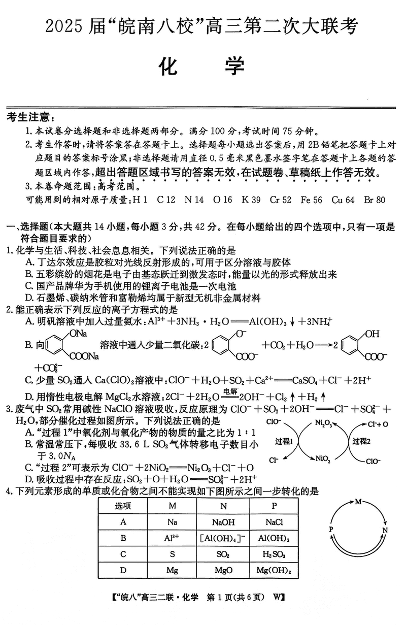 皖南八校2025届高三上学期第二次大联考化学试题及答案