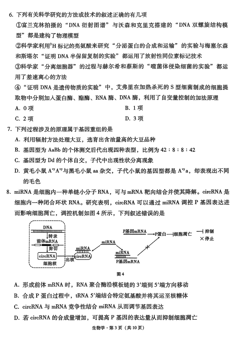 西南名校联盟2025届高三3+3+3诊断性联考(一)生物试题及答案