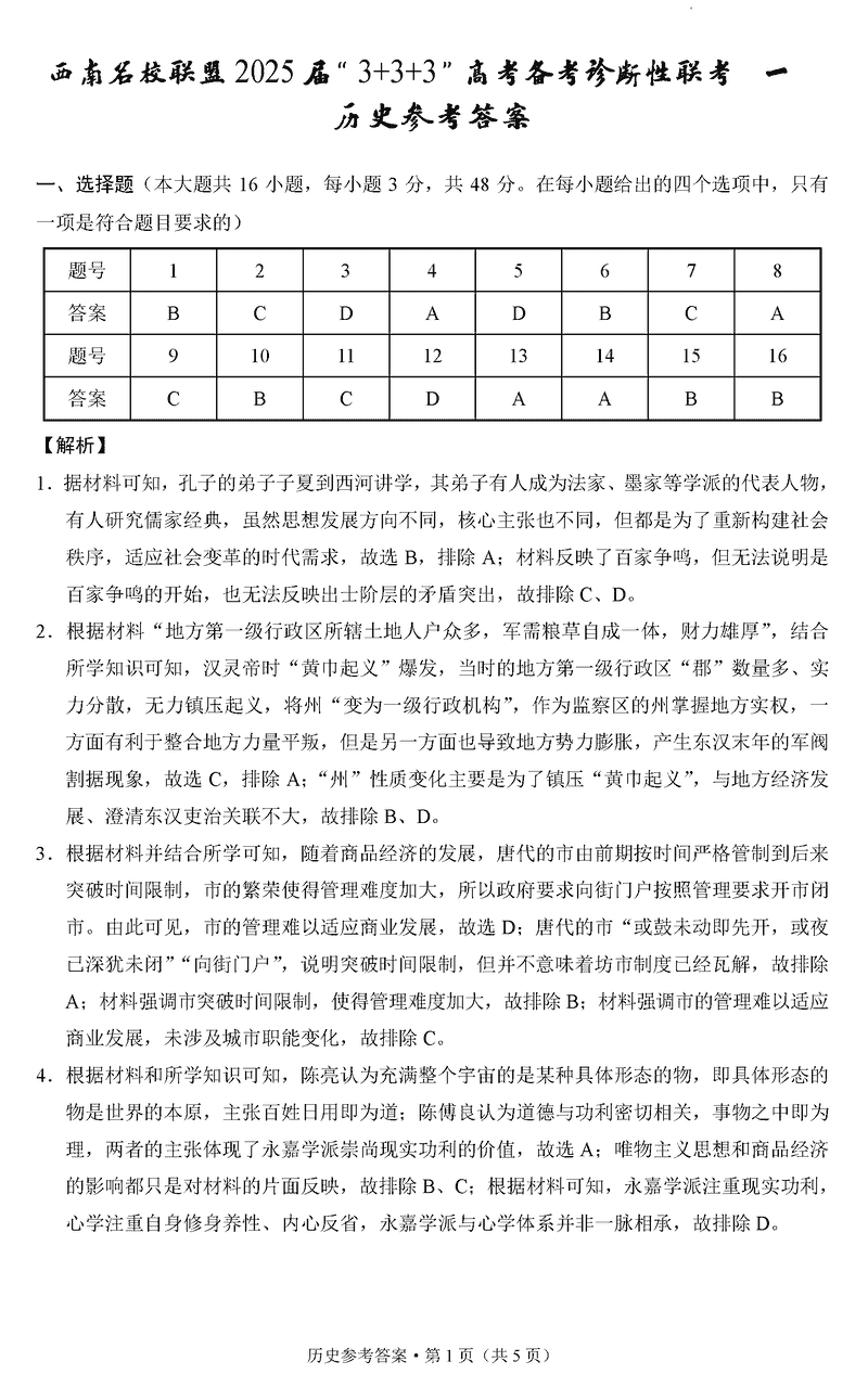 西南名校联盟2025届高三3+3+3诊断性联考(一)历史考试已于近日开考,为方便考生考后及时查看考试情况,查漏补缺、弥补不足,本文整理了试题答案解析相关信息!