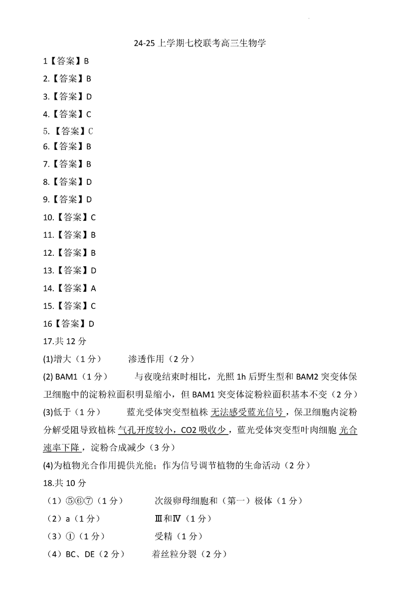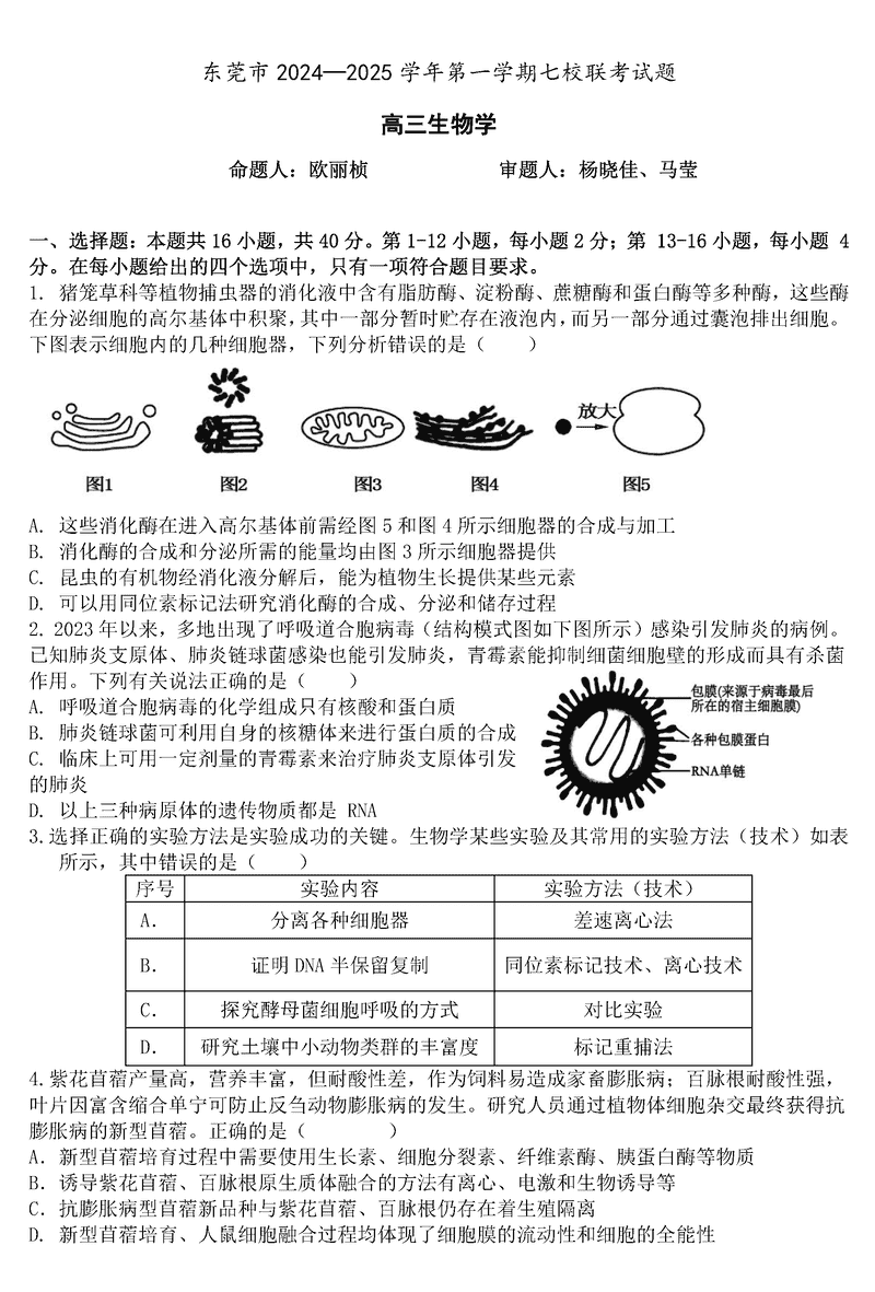 东莞七校联考2025届高三上学期12月月考生物试题及答案